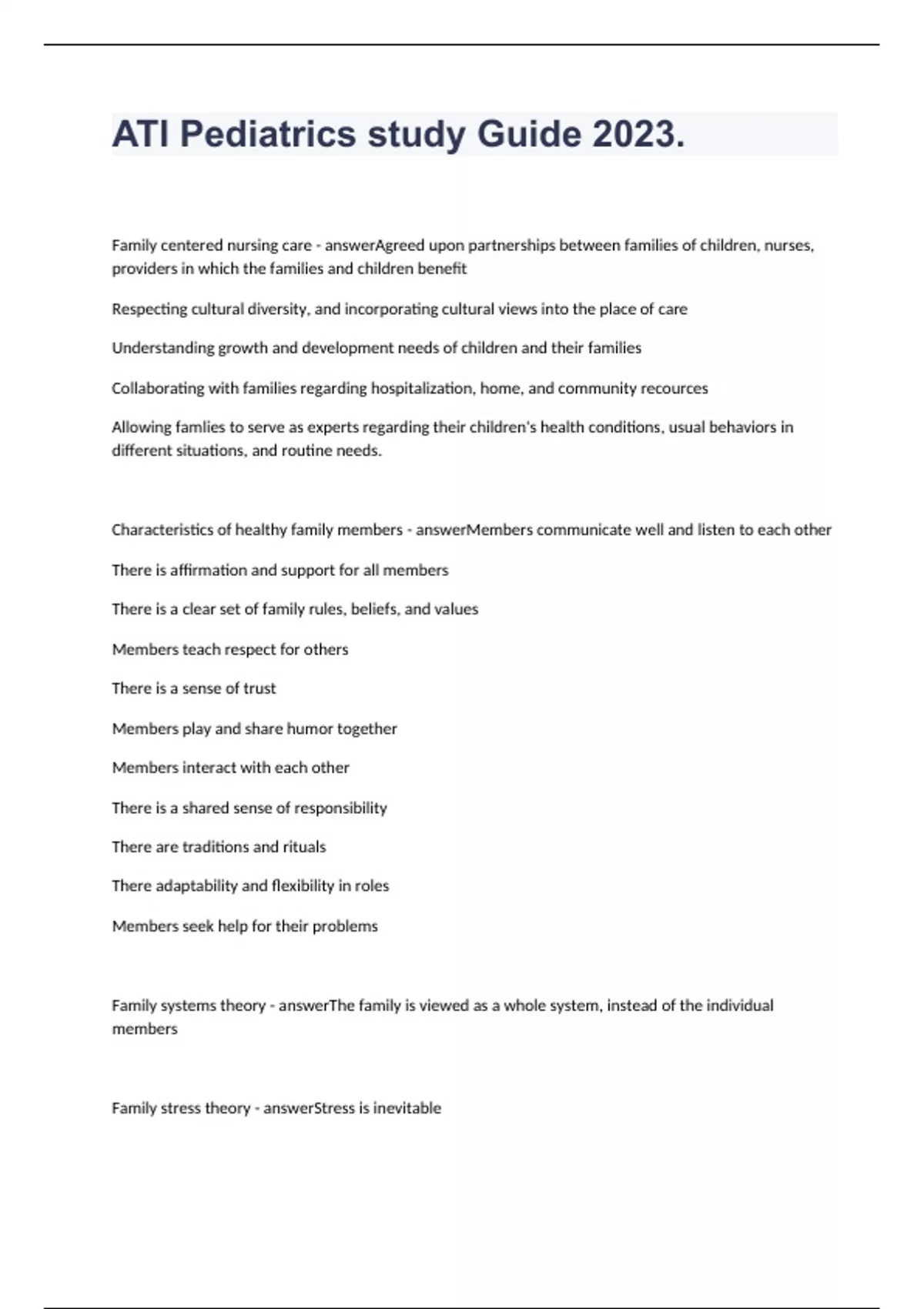 ATI Pediatrics study Guide Questions and Answer 2023. Family centered nursing care Agreed upon partnerships between families of children, nurses, providers in which the families and children benefit Respecting cultural diversity, and incorporating cultural views into the place of care Understanding growth and development needs of children and their families Collaborating with families regarding hospitalization, home, and community recources Allowing famlies to serve as experts regarding their children's health conditions, usual behaviors in different situations, and routine needs. Characteristics of healthy family members Members communicate well and listen to each other There is affirmation and support for all members There is a clear set of family rules, beliefs, and values Members teach respect for others There is a sense of trust Members play and share humor together Members interact with each other There is a shared sense of responsibility There are traditions and rituals There adaptability and flexibility in roles Members seek help for their problems Family systems theory The family is viewed as a whole system, instead of the individual members Family stress theory Stress is inevitable Stressors can be expected or unexpected Explains the reaction of a family to stress Offers guidance for adapting to stress Developmental family theory Views families as small groups that interact with the larger social system Traditional nuclear family Married couple and their biologic children (only full brothers and sisters) Nuclear family Two parents and their children (biologic, adoptive, step, foster) Single-parent family One parent and one or more children Blended Family (Reconstituted Family) At least one stepparent, stepsibling, or half-sibling