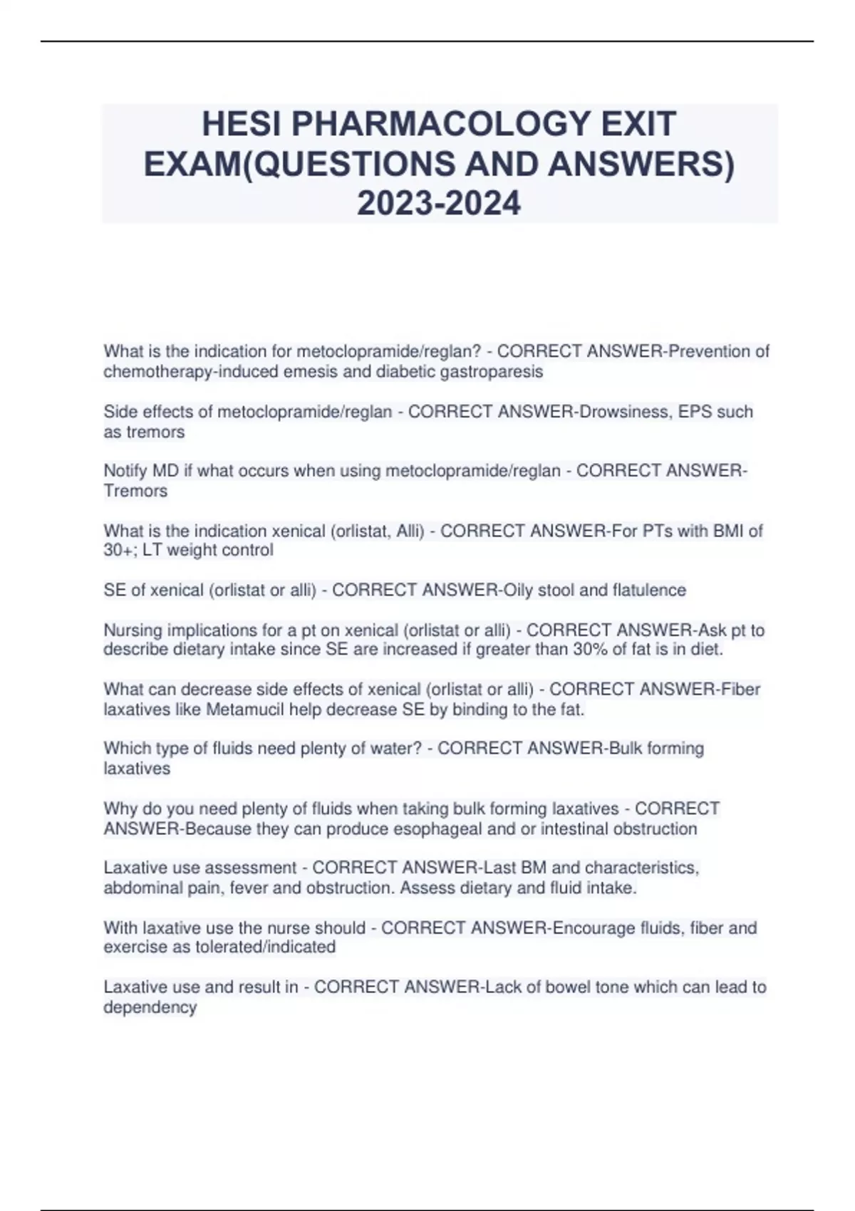 HESI PHARMACOLOGY EXIT EXAM(QUESTIONS AND ANSWERS) What is the indication for metoclopramide/reglan? - CORRECT ANSWER-Prevention of chemotherapy-induced emesis and diabetic gastroparesis Side effects of metoclopramide/reglan - CORRECT ANSWER-Drowsiness, EPS such as tremors Notify MD if what occurs when using metoclopramide/reglan - CORRECT ANSWERTremors What is the indication xenical (orlistat, Alli) - CORRECT ANSWER-For PTs with BMI of 30+; LT weight control SE of xenical (orlistat or alli) - CORRECT ANSWER-Oily stool and flatulence Nursing implications for a pt on xenical (orlistat or alli) - CORRECT ANSWER-Ask pt to describe dietary intake since SE are increased if greater than 30% of fat is in diet. What can decrease side effects of xenical (orlistat or alli) - CORRECT ANSWER-Fiber laxatives like Metamucil help decrease SE by binding to the fat. Which type of fluids need plenty of water? - CORRECT ANSWER-Bulk forming laxatives Why do you need plenty of fluids when taking bulk forming laxatives - CORRECT ANSWER-Because they can produce esophageal and or intestinal obstruction Laxative use assessment - CORRECT ANSWER-Last BM and characteristics, abdominal pain, fever and obstruction. Assess dietary and fluid intake. With laxative use the nurse should - CORRECT ANSWER-Encourage fluids, fiber and exercise as tolerated/indicated Laxative use and result in - CORRECT ANSWER-Lack of bowel tone which can lead to dependency what is ondansetron (zofran) - CORRECT ANSWER-antiemetic What is ondansetron (zofran)used for? - CORRECT ANSWER-Prevention of N/V associated with chemotherapy and radiation therapy. Who should you use caution with when giving ondansetron/zofran? - CORRECT ANSWER-PTs with liver failure Drugs for ulcerative colitis and crohns - CORRECT ANSWER-5 aminosalicylates; mesalamie, sulfasalazine. How do 5 aminosalicylates; (mesalamie, sulfasalazine) work? - CORRECT ANSWERThey decrease GI inflammation Side effects of 5 aminosalicylates; (mesalamie, sulfasalazine) - CORRECT ANSWERNausea, rash, arthralgia, hematological disorders Which drug can cause colitis/ - CORRECT ANSWER-Linezolid/zyvox What kind of infection is - CORRECT ANSWER-Suprainfection What is azithromycin/zithromax? - CORRECT ANSWER-An antibiotic What does azithromycin/zithromax treat? - CORRECT ANSWER-STDs such as: gonorrhea and chlamydia How much azithromycin/zithromax is usually required? - CORRECT ANSWER-One dose of 1g or 2g. If a female pt has trichomonas (any STI) and is asymptomatic does the male need to be tested? - CORRECT ANSWER-Yes! azithromycin/zithromax can cause what? - CORRECT ANSWER-Hepatotoxicityelevated liver enzymes What is nitrofurantoin/cipro used for? - CORRECT ANSWER-An antibiotic for UTI nitrofurantoin/cipro side effect - CORRECT ANSWER-Hepatotoxicity, skin reactions, neuropathy nitrofurantoin/cipro nursing considerations - CORRECT ANSWER-Give with milk or meals check LFTs. Watch for numbness or tingling of extremities this can be an irreversible peripheral neuropathy Drug of choice for treating ? - CORRECT ANSWER-Metronidazole/flagyl When is metronidazole/flagyl to be taken? - CORRECT ANSWER-With food and around the clock What should be avoided when taking metronidazole/flagyl and why? - CORRECT ANSWER-Alcohol; can cause a disulfiram-like reaction aminoglycosides examples - CORRECT ANSWER-gentamicin(garamycin), neomycin, tobramycin(nebcin) how are aminoglycosides ,(-mycin, -micin), administered? - CORRECT ANSWER-given IV for several days what is an adverse effect of aminoglycosides (-mycin, -micin) - CORRECT ANSWERdecreased hearing/ototoxicity and nephrotoxicity what labs need to be evaluated when given aminoglycosides (-mycin, -micin)? - CORRECT ANSWER-BUN and creatinine DOC for MRSA - CORRECT ANSWER-vancomycin what is MRSA - CORRECT ANSWER-severe staph infections that have become resistant to most antibiotics implications for giving vancomycin - CORRECT ANSWER-acute care requires frequent monitoring og serum drug level for dose adjustment. peak and trough schedule. trough is drawn just prior to next dose. risks when using vancomycin - CORRECT ANSWER-nephrotoxicity and ototoxicity SE of vancomycin - CORRECT ANSWER-thrombophlebitis, red man syndrome if infused too rapidly: flushing or rash of upper body, dyspnea, itching, hypotension- can be lethal how long should IV vancomycin infuse? - CORRECT ANSWER-greater than 60 minutes what is trimethoprim/sulfamethoxazole? - CORRECT ANSWER-it is a sulfonamide for treatment of UTI. combination increases efficacy and inhibits metabolism of folic acid at two different points what is trimethoprim/sulfamethoxazole known for? - CORRECT ANSWER-sulfa allergy nursing implications for trimethoprim/sulfamethoxazole - CORRECT ANSWER-assess for rash due to potential for stevens johnson syndrome penicillins have a ____ to ____ - CORRECT ANSWER-cross-sensitivity; cephalosporins. they are structurally similar. nursing considerations for penicillins - CORRECT ANSWER-observe respiratory status for first 30 minutes when administering for the first time. watch for anaphylaxis if allergic to one or the other may have cross sensitivity what can a nurse treat penicillin anaphylaxis with? - CORRECT ANSWER-epinephrine nursing considerations for antibiotics - CORRECT ANSWER-do not take for viral illnesses. take entire prescription as ordered. don't take if not needed as it can produce resistance. what is ribavirin(copegus) indicated for? - CORRECT ANSWER-antiviral for treatment of hepatitis C that has failed other treatment ribavirin(copegus) SE - CORRECT ANSWER-hemolytic anemia what is ticarcillin/clavulanic acid (timentin)? - CORRECT ANSWER-broad spectrum/extended spectrum penicillins nursing considerations for ticarcillin/clavulanic acid (timentin) - CORRECT ANSWER-do not administer in same infusion with aminoglycosides what is the indicated use for rifampin? - CORRECT ANSWER-antitubercular for treatment of TB rifampin SE - CORRECT ANSWER-turns: body fluids; tears, saliva, urine, 