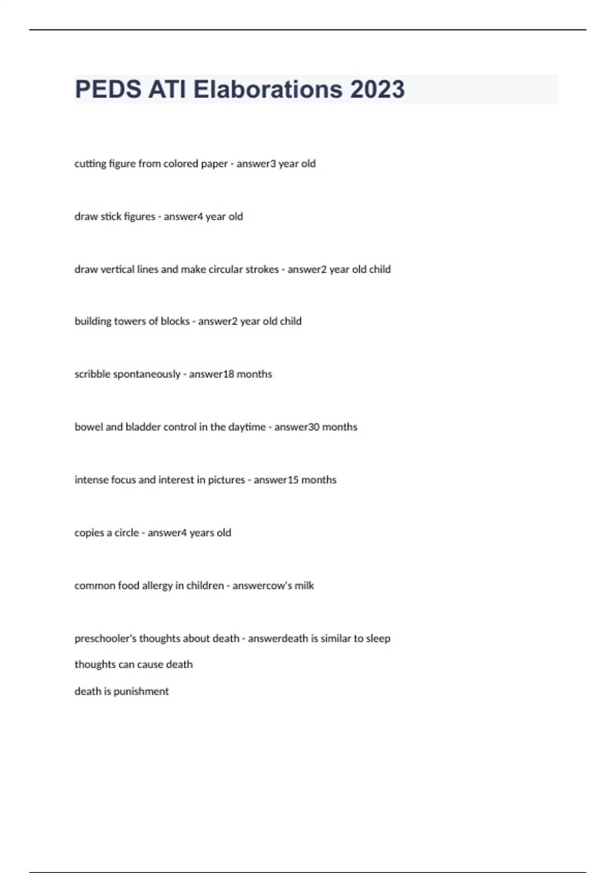 PEDS ATI Elaborated Questions and Answers 2023 cutting figure from colored paper 3 year old draw stick figures 4 year old draw vertical lines and make circular strokes 2 year old child building towers of blocks 2 year old child scribble spontaneously 18 months bowel and bladder control in the daytime 30 months