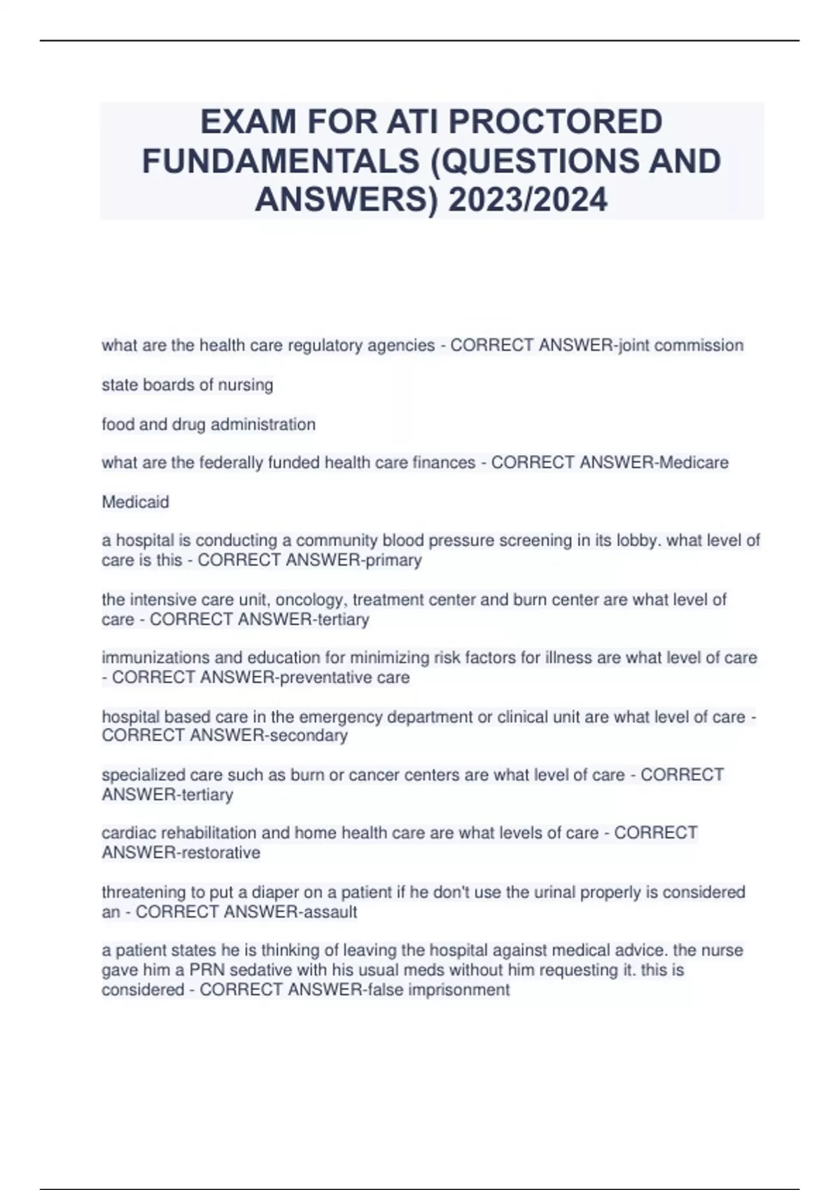 EXAM FOR ATI PROCTORED FUNDAMENTALS (QUESTIONS AND ANSWERS) 2023/2024 what are the health care regulatory agencies - CORRECT ANSWER-joint commission state boards of nursing food and drug administration what are the federally funded health care finances - CORRECT ANSWER-Medicare Medicaid a hospital is conducting a community blood pressure screening in its lobby. what level of care is this - CORRECT ANSWER-primary the intensive care unit, oncology, treatment center and burn center are what level of care - CORRECT ANSWER-tertiary immunizations and education for minimizing risk factors for illness are what level of care - CORRECT ANSWER-preventative care hospital based care in the emergency department or clinical unit are what level of care - CORRECT ANSWER-secondary specialized care such as burn or cancer centers are what level of care - CORRECT ANSWER-tertiary cardiac rehabilitation and home health care are what levels of care - CORRECT ANSWER-restorative threatening to put a diaper on a patient if he don't use the urinal properly is considered an - CORRECT ANSWER-assault a patient states he is thinking of leaving the hospital against medical advice. the nurse gave him a PRN sedative with his usual meds without him requesting it. this is considered - CORRECT ANSWER-false imprisonment what would be included in a plan of care for a patient with pertussis - CORRECT ANSWER-wear a mask when providing care within 3ft of the client place a surgical mask on the client if being transported to another unit wear a gown when performing care that involves secretions linear clusters of fluid-contsining vesicles with some crusting - CORRECT ANSWERherpes zoster a client reports severe sore throat, pain when swallowing and swollen lymph nodes. what stage of infection is this - CORRECT ANSWER-illness what are clinical manifestations of localized versus a systemic infection - CORRECT ANSWER-fever malaise increase in pulse and respiratory rate what actions should be taken to reduce risk of falls - CORRECT ANSWER-call light in reach provide nonskid footwear complete fall risk assessment what are actions for a patient who has had a seizure - CORRECT ANSWER-place patient on side administer meds as prescribed be prepared to insert airway do not leave client alone during a seizure what is the priority action for a client with a history of falls - CORRECT ANSWERcomplete a fall risk assessment what are interventions for seclusion and restraints - CORRECT ANSWER-assess restraints every 2 hours assess food, fluids, comfort, and safety and document every 15-30 mins what should be included in a teaching about carbon monoxide poisoning - CORRECT ANSWER-carbon monoxide binds with hemoglobin in the body a client who has a heat stroke will have what - CORRECT ANSWER-hypotension who is at risk for complications from food poisoning - CORRECT ANSWERimmunocompromised individuals clients as risk for food poisoning are instructed to eat and drink what - CORRECT ANSWER-only pasteurized milk, yogurt, cheese and other dairy products what bed position should the bed be in for a client receiving eternal tube feeding due to dysphagia - CORRECT ANSWER-semi-fowlers a client asks to move from the bed to the chair what is the priority action - CORRECT ANSWER-assess the clients ability to help with the transfer 21 year old with a sore throat tells doctor he has not seen the doctor since highschool. what screening should be done - CORRECT ANSWER-testicular exam what should be included in health promotion and primary prevention for a school-aged child - CORRECT ANSWER-child obesity substance use disorder scoliosis stranger awareness what is the first sign of maturation in boys - CORRECT ANSWER-enlargement of the testes and the scrotum what are the recommended immunizations for adolescents 12-22 - CORRECT ANSWER-varicella human papilloma virus seasonal influenza scoliosis is more common with who and when should screening be done - CORRECT ANSWER-girls and during adolescents growth spurts what vaccines are appropriate for young adults 20-35 - CORRECT ANSWER-human papilloma virus measles, mumps, rubella varicella what is an example of a middle aged adults psychosocial development - CORRECT ANSWER-expressing concern about the next generation welcome opportunities to be creative and productive become involved with community issues what are expected decreases in physical function of a middle age adult - CORRECT ANSWER-metabolism gastric secretion glomerular function what immunizations are recommended for a middle aged adult 35-65 - CORRECT ANSWER-varicella herpes zoster influenza what should be asked for a older adult who loses weight - CORRECT ANSWER-do you eat alone or with someone have you started any new meds what have you eaten in the last 24 hour are you on a fixed income what immunizations are recommended for an older adult 65 and older - CORRECT ANSWER-pneumococcal immunizations eye exam mental health screening DEXA scanning what nutritional interventions are recommended for older adults - CORRECT ANSWERincrease calcium and fiber decrease sodium what are expected changes in aging - CORRECT ANSWER-decreased height nail thickening