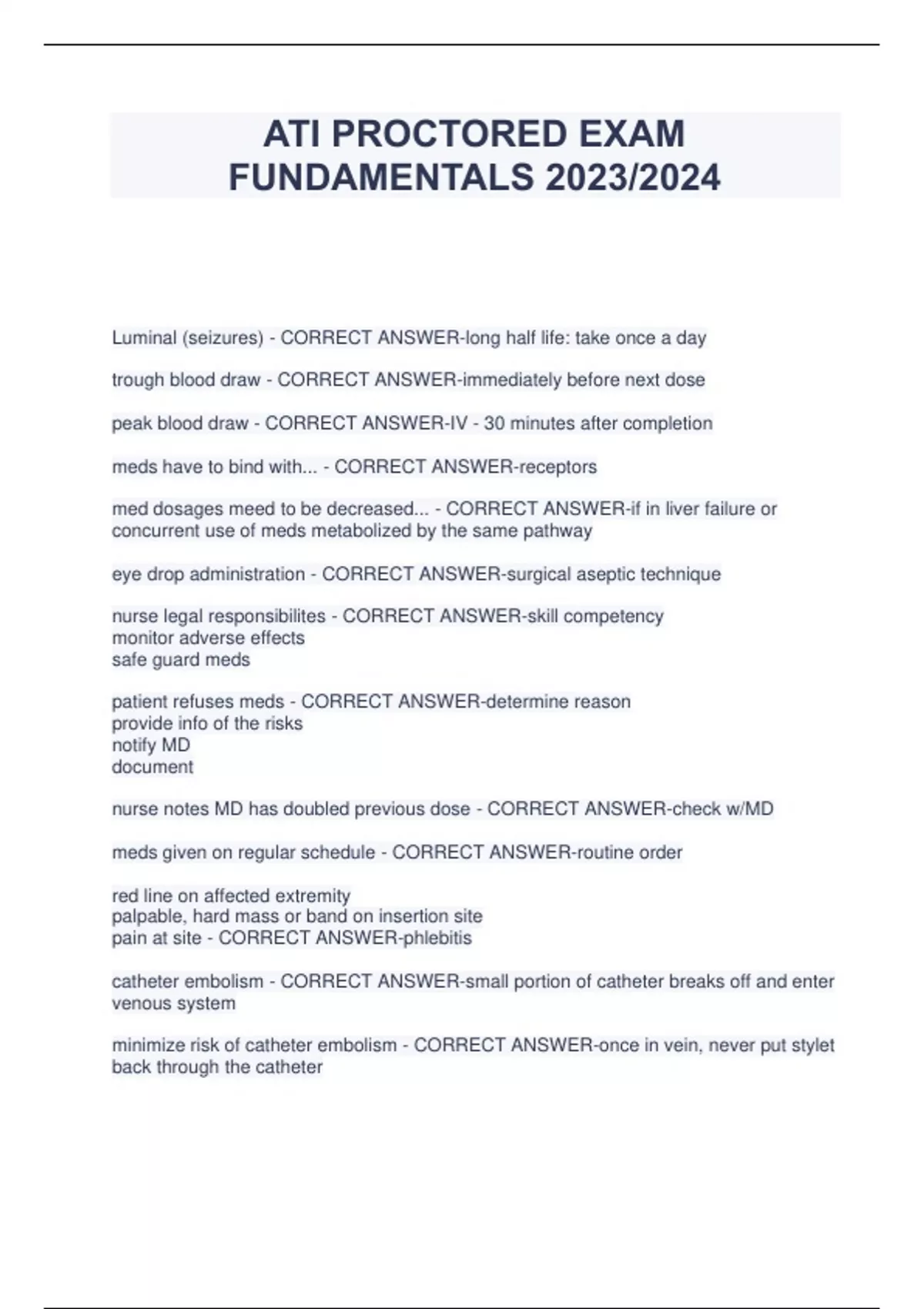 ATI PROCTORED EXAM FUNDAMENTALS 2023/2024 Luminal (seizures) - CORRECT ANSWER-long half life: take once a day trough blood draw - CORRECT ANSWER-immediately before next dose peak blood draw - CORRECT ANSWER-IV - 30 minutes after completion meds have to bind with... - CORRECT ANSWER-receptors med dosages meed to be decreased... - CORRECT ANSWER-if in liver failure or concurrent use of meds metabolized by the same pathway eye drop administration - CORRECT ANSWER-surgical aseptic technique nurse legal responsibilites - CORRECT ANSWER-skill competency monitor adverse effects safe guard meds patient refuses meds - CORRECT ANSWER-determine reason provide info of the risks notify MD document nurse notes MD has doubled previous dose - CORRECT ANSWER-check w/MD meds given on regular schedule - CORRECT ANSWER-routine order red line on affected extremity palpable, hard mass or band on insertion site pain at site - CORRECT ANSWER-phlebitis catheter embolism - CORRECT ANSWER-small portion of catheter breaks off and enter venous system minimize risk of catheter embolism - CORRECT ANSWER-once in vein, never put stylet back through the catheter symptoms of fluid overload - CORRECT ANSWER-shortness of breath crackles in lungs distended neck veins concurrent use of coumadin and aspirin..... - CORRECT ANSWER-increases risk of bleeding first dose of penicillin, client says rash developed last time they took it.... - CORRECT ANSWER-withhold and notify MD when administering antihypertensives, teach the client,,, - CORRECT ANSWER-change positions slowly (orthostatic hypotension) fewer protein-binding sites (infant)... - CORRECT ANSWER-medication effects will be increase w/greater potential of toxicity breastfeeding mom does not want to take antimicrobial medication because it may harm her baby. Teach... - CORRECT ANSWER-taking the medication immediately after breastfeeding will mimize effects on the baby reduced hepatic funtion... - CORRECT ANSWER-prolongs half life of a medication and increases length of response antidote for benzodiazepine - CORRECT ANSWER-Flumazinel (Romazicon) effective teaching of benzodiapines... - CORRECT ANSWER-I will not stop taking the drug abruptly Buspirone (Buspar) is unique because... - CORRECT ANSWER-does not cause physical or psychological dependence a client taking Buspar for 3 days calls and says not helping to sleep or w anxiety. Nurse response... - CORRECT ANSWER-initial response to Buspar takes 1 week. Several weeks to reach therapeutic peak client taking Paxil complains of teeth grinding (Bruxism). Nurse response... - CORRECT ANSWER-add Buspar use a mouthguard any SSRI caused bruxism, so change class client taking Nardil for depression should be monitored for... - CORRECT ANSWERorthostatic hypotension (all MAOIs can cause orthostatic hypotension) side effects of Elavil - CORRECT ANSWER-orthostatic hypotension dry mouth drug glass that interacts with tyramines - CORRECT ANSWER-MAOIs adverse affect of Prozac - CORRECT ANSWER-sexual dysfuntion signs of seratonin sydrome - CORRECT ANSWER-change in mental status, tremors, hyperreflexia lithium level - CORRECT ANSWER-0.4 - 1.0 NSAIDs interact with... - CORRECT ANSWER-lithium teaching client to avoid lithium toxicity... - CORRECT ANSWER-avoid activities that could cause sodium/water depletion adverse affect of lithium - CORRECT ANSWER-tremors client taking Depakote, monitor these labs (3) - CORRECT ANSWER-thrombocyte count amylasel level liver function schizophrenia positive symptoms relate to: - CORRECT ANSWER-behavior, thought, speech schizophrenia negative symptoms relate to: - CORRECT ANSWER-social withdrawal, lack of emotion, lack of energy client taking Thorazine would have improvement in which symptoms... - CORRECT ANSWER-positive symptoms client taking Proloxin c/o anticholinergic effects - CORRECT ANSWER-chew gum sip liquids suck hard candy several hours after administering a typical antipsychotic monitor: - CORRECT ANSWER-acute dystonia (neck spasms) client taking Clozaril, nurse should monitor this lab - CORRECT ANSWER-WBC (agranulocytosis) clients taking SSRI (Prozac) should be monitored for.... - CORRECT ANSWER-fever, hyperreflexia, agitation, hallucinations with in the first 2-72 hours (Seratonin Syndrome) adverse effects of Elavil (Tricyclic) - CORRECT ANSWER-photophobia (anticholinergic effect) Strattera adverse effects - CORRECT ANSWER-liver damage Concerta (ADHD) - CORRECT ANSWER-long acting, take once daily Inderal treats... - CORRECT ANSWER-alcohol withdrawal/cravings short term management of alchol withdrawal... - CORRECT ANSWER-ativan valium Dilantin side effects - CORRECT ANSWER-gingival hyperplasia Zarontin Depakote treat... - CORRECT ANSWER-absence seizures levodopa food interaction... - CORRECT ANSWER-avoid high protein meals (amino acids) Mirapex (Parkinson's Disease) side effects - CORRECT ANSWER-hallucinations after instilling eye drops press... - CORRECT ANSWER-nasolacrimal duct w/a gloved hand and clean tissue for 30 to 60 seconds Alphagan (opthamalic) - CORRECT ANSWER-take contact lens out and wait 15 minutes to avoid interaction angle-closure glaucoma... - CORRECT ANSWER-halos around lights client diagnosed with malignant hyperthermia caused by (Anectine) succinylcholine should be given... - CORRECT ANSWER-Dantrium, to slow the metabolic activity of the muscles K+ levels - CORRECT ANSWER-3.5 - 5.0 abrupt withdrawal from baclofen cause...s - CORRECT ANSWER-seizures Ditropan treats: - CORRECT ANSWER-urge to void nocturia Valium - CORRECT ANSWER-monitor for respiratory depression Intal - CORRECT ANSWER-prophylactic treatment of asthma for long term control take on a fixed dose schedule not used to abort an asthma attack QVAR (glucocorticoid) tx: asthma - CORRECT ANSWER-use a spacer