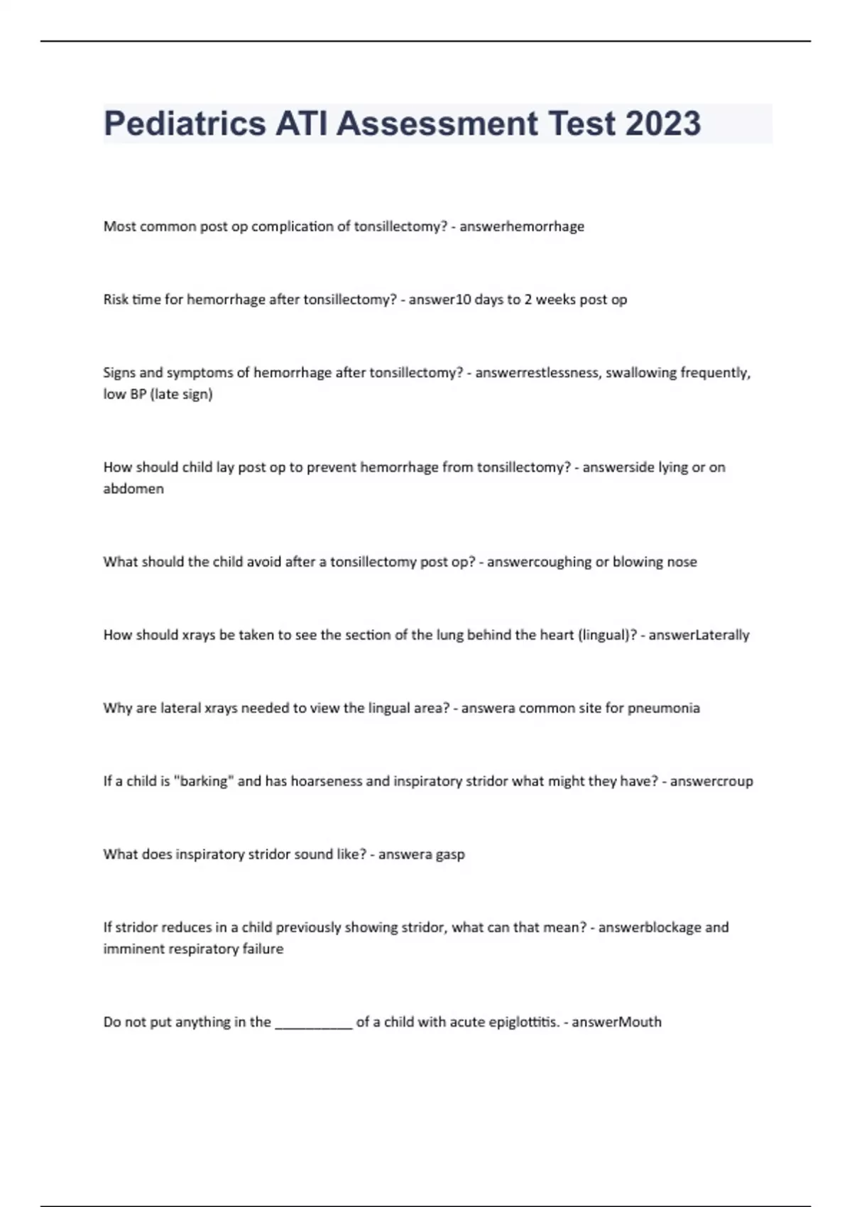 Pediatrics ATI Assessment Test Questions and Answers 2023. Most common post op complication of tonsillectomy? hemorrhage Risk time for hemorrhage after tonsillectomy? 10 days to 2 weeks post op Signs and symptoms of hemorrhage after tonsillectomy? restlessness, swallowing frequently, low BP (late sign) How should child lay post op to prevent hemorrhage from tonsillectomy? side lying or on abdomen What should the child avoid after a tonsillectomy post op? coughing or blowing nose How should xrays be taken to see the section of the lung behind the heart (lingual)? Laterally