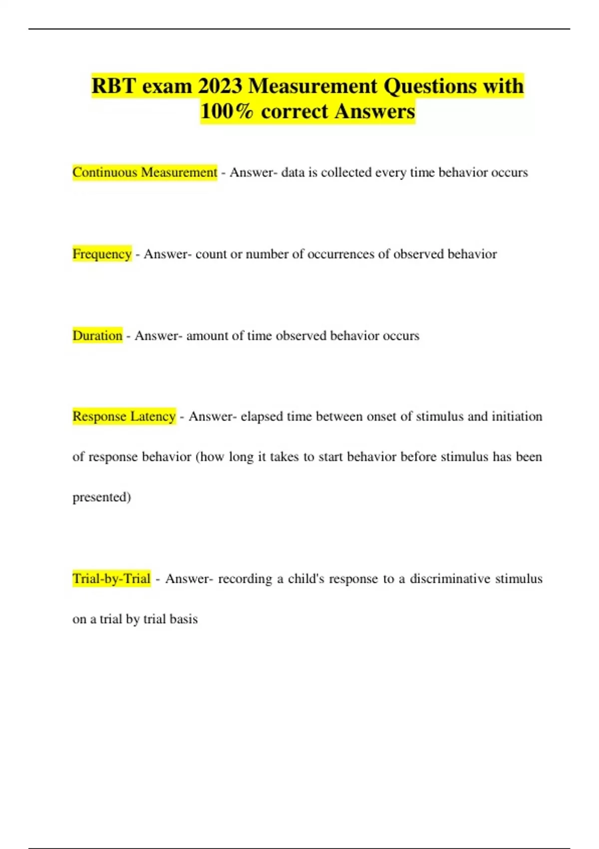 Continuous Measurement - Answer- data is collected every time behavior occurs Frequency - Answer- count or number of occurrences of observed behavior Duration - Answer- amount of time observed behavior occurs Response Latency - Answer- elapsed time between onset of stimulus and initiation of response behavior (how long it takes to start behavior before stimulus has been presented) Trial-by-Trial - Answer- recording a child's response to a discriminative stimulus on a trial by trial basisDiscontinuous Measurement - Answer- measurement conducted in a manner such that some instances of response class(es) of interest may not be detected Whole Interval - Answer- record if behavior occurred throughout entire interval Partial Interval - Answer- record if behavior occurred at anytime during interval Momentary Time Sampling - Answer- record if behavior occurred the moment each interval ends.