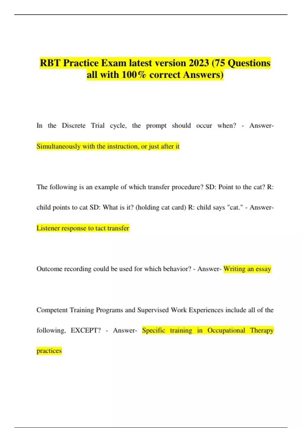 In the Discrete Trial cycle, the prompt should occur when? - AnswerSimultaneously with the instruction, or just after it The following is an example of which transfer procedure? SD: Point to the cat? R: child points to cat SD: What is it? (holding cat card) R: child says "cat." - AnswerListener response to tact transfer Outcome recording could be used for which behavior? - Answer- Writing an essay Competent Training Programs and Supervised Work Experiences include all of the following, EXCEPT? - Answer- Specific training in Occupational Therapy practicesBreaking a complex skill into smaller, teachable units is the definition of... - Answer- Task Analysis When you document you should attempt to document only... - Answer- What was observed, not interpretations of what was observed Which of the following is not a part of a Behavior Intervention Plan (BIP)? - Answer- How the child feels when the behavior is occurring What can be used to determine existing nonsocial and social reinforcers? - Answer- A preference assessment If a Behavior Technician measured the length of time that it took Andrew to respond to someone calling him, she would be measuring the... -