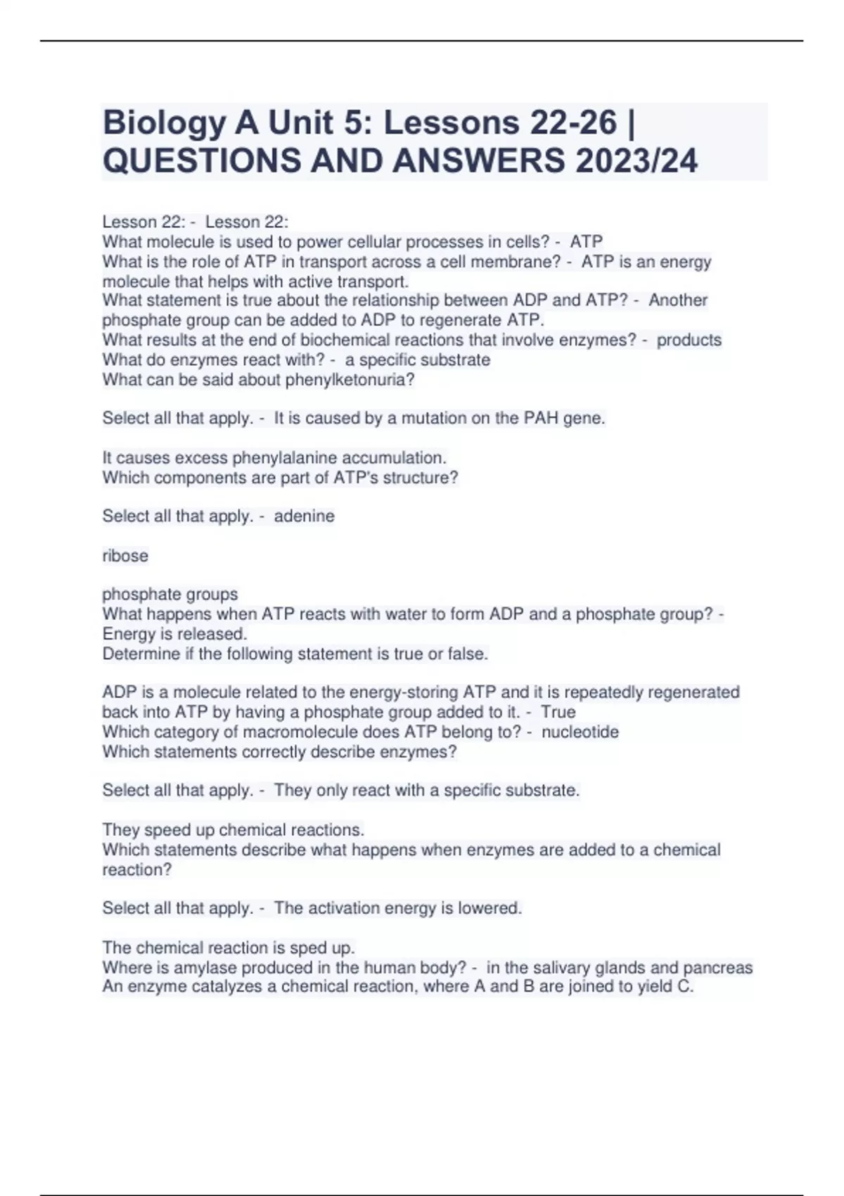 Biology A Unit 5: Lessons 22-26 | QUESTIONS AND ANSWERS 2023/24 Lesson 22: - Lesson 22: What molecule is used to power cellular processes in cells? - ATP What is the role of ATP in transport across a cell membrane? - ATP is an energy molecule that helps with active transport. What statement is true about the relationship between ADP and ATP? - Another phosphate group can be added to ADP to regenerate ATP. What results at the end of biochemical reactions that involve enzymes? - products What do enzymes react with? - a specific substrate What can be said about phenylketonuria? Select all that apply. - It is caused by a mutation on the PAH gene. It causes excess phenylalanine accumulation. Which components are part of ATP's structure? Select all that apply. - adenine ribose phosphate groups What happens when ATP reacts with water to form ADP and a phosphate group? - Energy is released. Determine if the following statement is true or false. ADP is a molecule related to the energy-storing ATP and it is repeatedly regenerated back into ATP by having a phosphate group added to it. - True Which category of macromolecule does ATP belong to? - nucleotide Which statements correctly describe enzymes? Select all that apply. - They only react with a specific substrate. They speed up chemical reactions. Which statements describe what happens when enzymes are added to a chemical reaction? Select all that apply. - The activation energy is lowered. The chemical reaction is sped up. Where is amylase produced in the human body? - in the salivary glands and pancreas An enzyme catalyzes a chemical reaction, where A and B are joined to yield C. What statement is correct about this reaction? - A and B are reactants. Study the image. Which labeled part is the active site? - B
