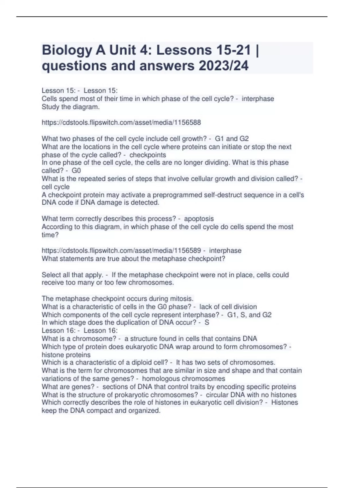 Biology A Unit 4: Lessons 15-21 | questions and answers 2023/24 Lesson 15: - Lesson 15: Cells spend most of their time in which phase of the cell cycle? - interphase Study the diagram. What two phases of the cell cycle include cell growth? - G1 and G2 What are the locations in the cell cycle where proteins can initiate or stop the next phase of the cycle called? - checkpoints In one phase of the cell cycle, the cells are no longer dividing. What is this phase called? - G0 What is the repeated series of steps that involve cellular growth and division called? - cell cycle A checkpoint protein may activate a preprogrammed self-destruct sequence in a cell's DNA code if DNA damage is detected. What term correctly describes this process? - apoptosis According to this diagram, in which phase of the cell cycle do cells spend the most time? What statements are true about the metaphase checkpoint? Select all that apply. - If the metaphase checkpoint were not in place, cells could receive too many or too few chromosomes. The metaphase checkpoint occurs during mitosis. What is a characteristic of cells in the G0 phase? - lack of cell division Which components of the cell cycle represent interphase? - G1, S, and G2 In which stage does the duplication of DNA occur? - S Lesson 16: - Lesson 16: What is a chromosome? - a structure found in cells that contains DNA Which type of protein does eukaryotic DNA wrap around to form chromosomes? - histone proteins Which is a characteristic of a diploid cell? - It has two sets of chromosomes. What is the term for chromosomes that are similar in size and shape and that contain variations of the same genes? - homologous chromosomes What are genes? - sections of DNA that control traits by encoding specific proteins What is the structure of prokaryotic chromosomes? - circular DNA with no histones Which correctly describes the role of histones in eukaryotic cell division? - Histones keep the DNA compact and organized. A structure has these features: It is inside a pr