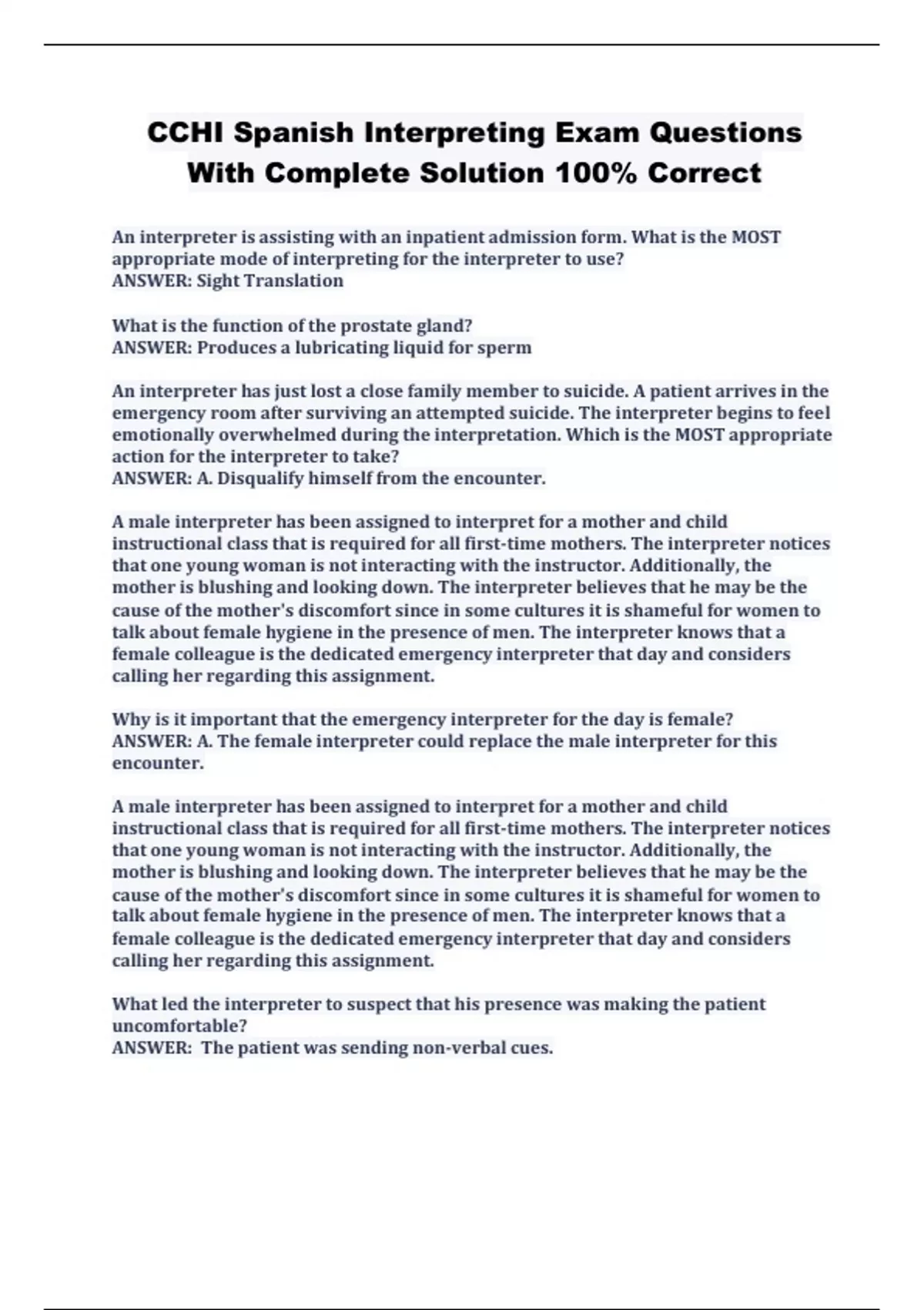 CCHI Spanish Interpreting Exam Questions With Complete Solution 100% Correct