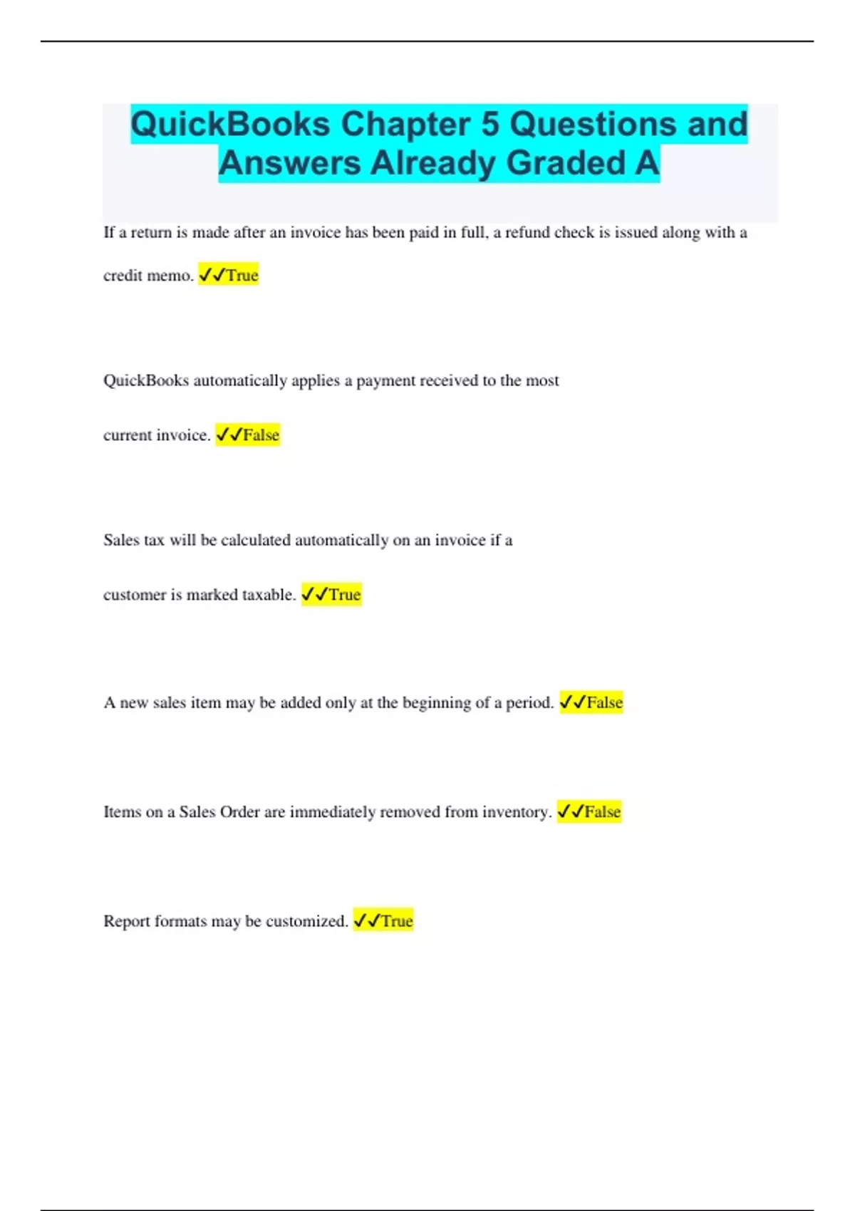 If a return is made after an invoice has been paid in full, a refund check is issued along with a credit memo. True QuickBooks automatically applies a payment received to the most current invoice. False Sales tax will be calculated automatically on an invoice if a customer is marked taxable. True A new sales item may be added only at the beginning of a period. False