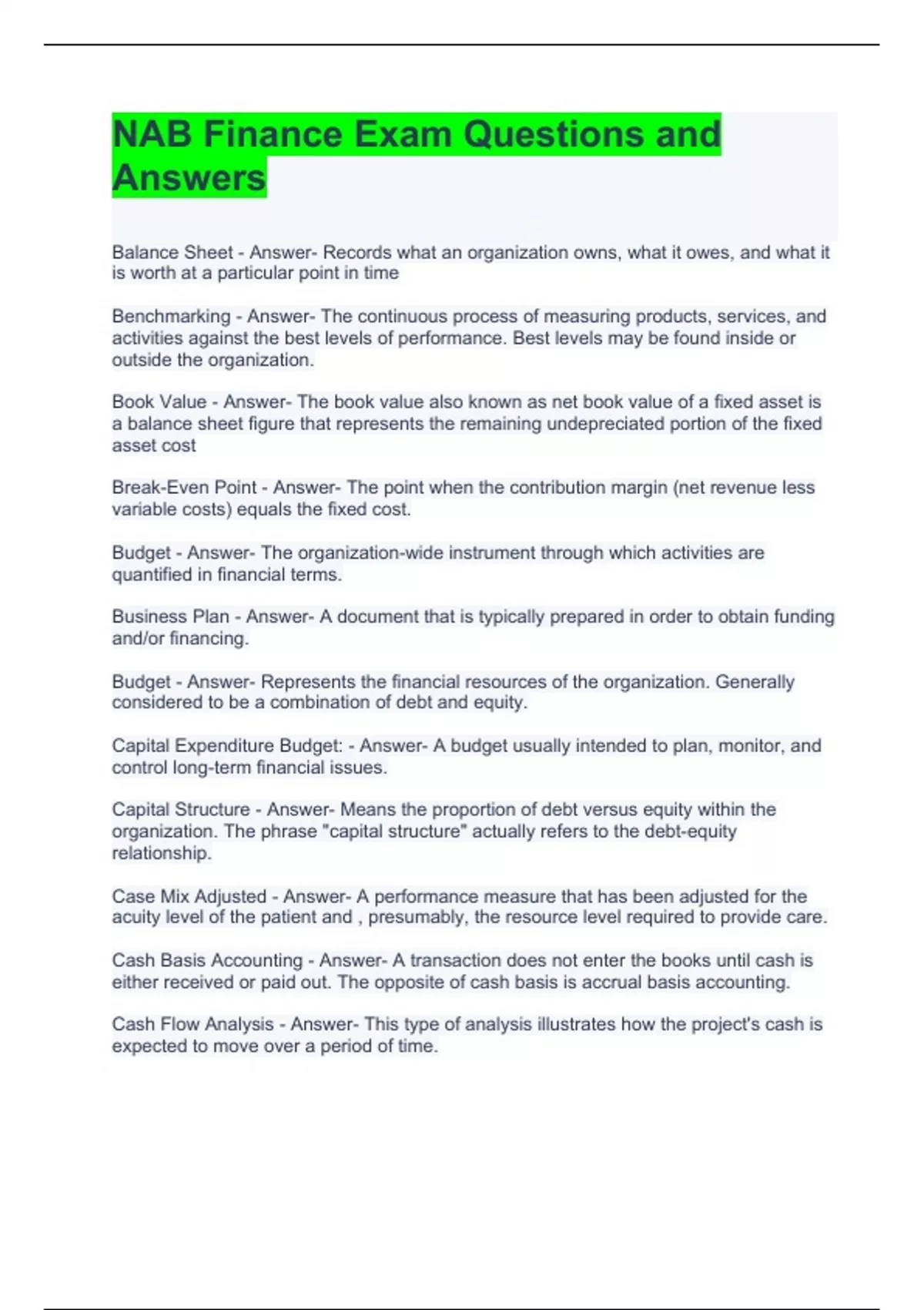 NAB Finance Exam Questions and Answers