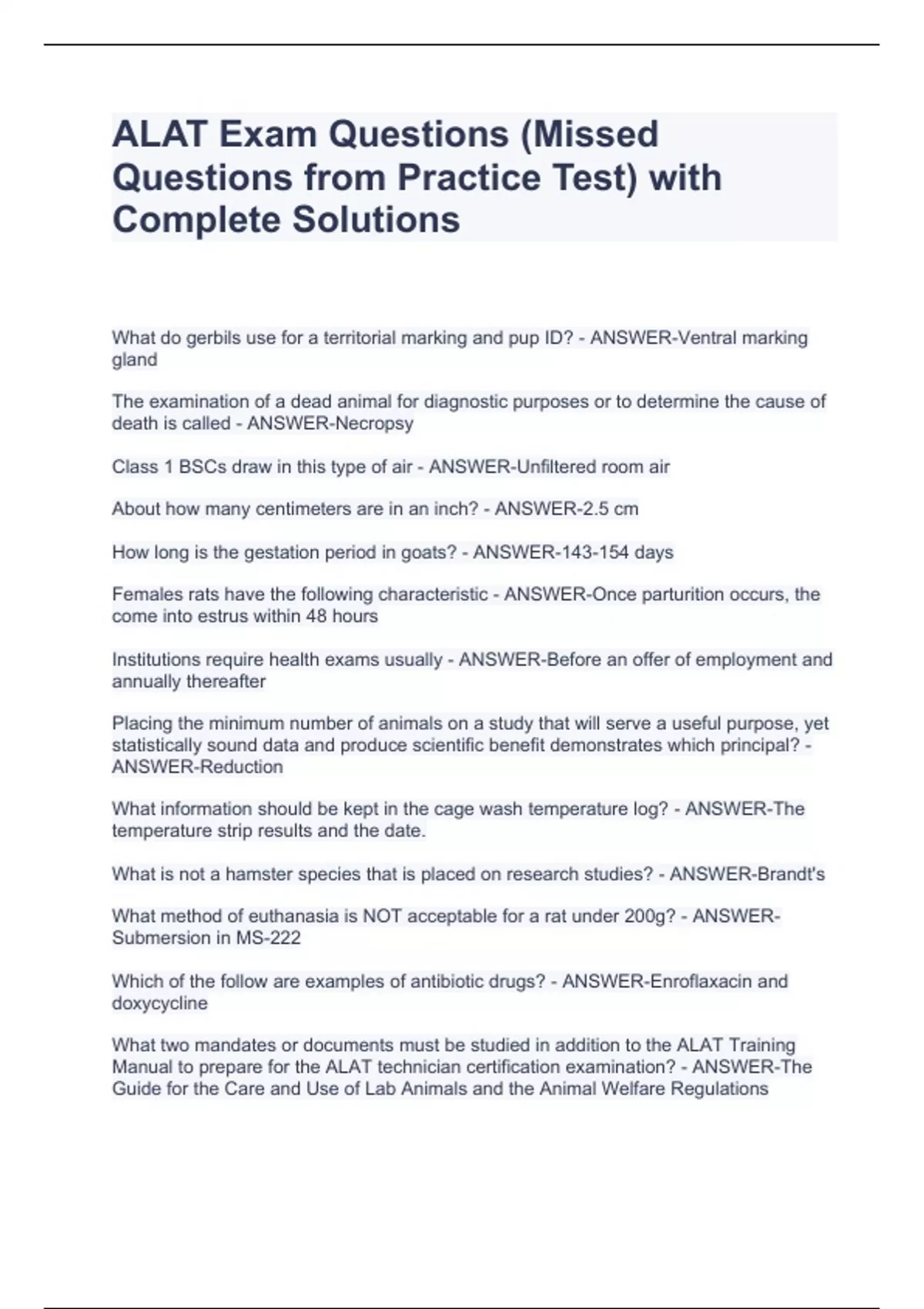 ALAT Exam Questions (Missed Questions from Practice Test) with Complete Solutions ALAT Exam Questions (Missed Questions from Practice Test) with Complete Solutions ALAT Exam Questions (Missed Questions from Practice Test) with Complete Solutions ALAT Exam Questions (Missed Questions from Practice Test) with Complete Solutions What do gerbils use for a territorial marking and pup ID? - ANSWER-Ventral marking gland The examination of a dead animal for diagnostic purposes or to determine the cause of death is called - ANSWER-Necropsy Class 1 BSCs draw in this type of air - ANSWER-Unfiltered room air About how many centimeters are in an inch? - ANSWER-2.5 cm How long is the gestation period in goats? - ANSWER-143-154 days