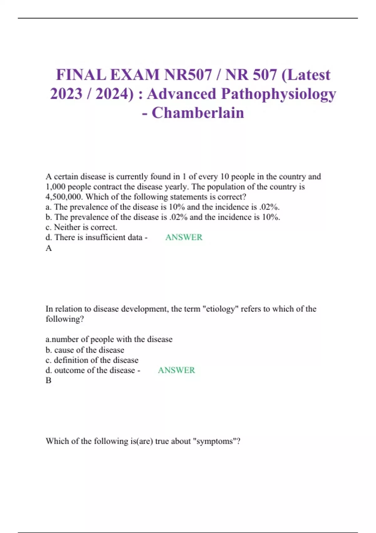 FINAL EXAM NR507 / NR 507 (Latest 2023 / 2024) : Advanced Pathophysiology - Chamberlain A certain disease is currently found in 1 of every 10 people in the country and 1,000 people contract the disease yearly. The population of the country is 4,500,000. Which of the following statements is correct? a. The prevalence of the disease is 10% and the incidence is .02%. b. The prevalence of the disease is .02% and the incidence is 10%. c. Neither is correct. d. There is insufficient data - ANSWER A In relation to disease development, the term "etiology" refers to which of the following? r of people with the disease b. cause of the disease c. definition of the disease d. outcome of the disease - ANSWER B Which of the following is(are) true about "symptoms"? a. objective and measurable b. the same as "signs" c. both of the above d. neither of the above - ANSWER D In 1992, there were 980 deaths in a Midwestern city with a population of 1,000,000. At the beginning of that year, 900 cases of AIDS existed in this population. During the year, 250 new cases of AIDS were diagnosed, and 75 people died of the disease in 1992. Using the data given above, what was the incidence rate (per 100,000 population) at the end of 1992 for AIDS? a. 6 b. 25 c. 88 d. 116 - ANSWER B What level of prevention is a blood pressure screening program for high school students who are pregnant? a. primary b. secondary c. tertiary - ANSWER B Mr. Forbes complains of "indigestion" and becomes sweaty and pale. His wife takes him to the Emergency Department at Northwestern Memorial Hospital. A cardiac catheterization 2 days later shows partial blockage of his right coronary artery (RCA). Blockage of the right coronary artery can lead to myocardial cell injury because it results in which of the following? a. bilirubin accumulation in myocardial cells b. alteration in the genetic material of myocardial cells c. reduced energy production in myocardial cells d. activation of the complement system - ANSWER C