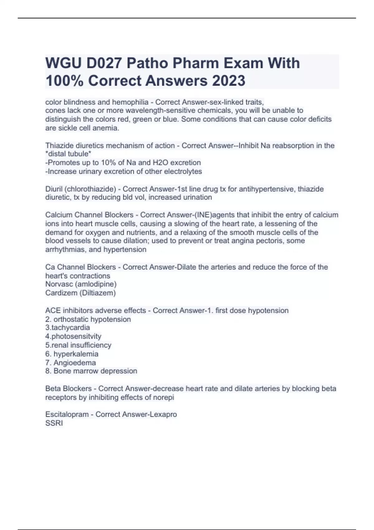 color blindness and hemophilia - Correct Answer-sex-linked traits, cones lack one or more wavelength-sensitive chemicals, you will be unable to distinguish the colors red, green or blue. Some conditions that can cause color deficits are sickle cell anemia. Thiazide diuretics mechanism of action - Correct Answer--Inhibit Na reabsorption in the *distal tubule* -Promotes up to 10% of Na and H2O excretion -Increase urinary excretion of other electrolytes Diuril (chlorothiazide) - Correct Answer-1st line drug tx for antihypertensive, thiazide diuretic, tx by reducing bld vol, increased urination Calcium Channel Blockers - Correct Answer-(INE)agents that inhibit the entry of calcium ions into heart muscle cells, causing a slowing of the heart rate, a lessening of the demand for oxygen and nutrients, and a relaxing of the smooth muscle cells of the blood vessels to cause dilation; used to prevent or treat angina pectoris, some arrhythmias, and hypertension Ca Channel Blockers - Correct Answer-Dilate the arteries and reduce the force of the heart's contractions Norvasc (amlodipine) Cardizem (Diltiazem) ACE inhibitors adverse effects - Correct Answer-1. first dose hypotension 2. orthostatic hypotension cardia sensitvity insufficiency 6. hyperkalemia 7. Angioedema 8. Bone marrow depression Beta Blockers - Correct Answer-decrease heart rate and dilate arteries by blocking beta receptors by inhibiting effects of norepi Escitalopram - Correct Answer-Lexapro SSRI pituitary gland - Correct Answer-The endocrine system's most influential gland. Under the influence of the hypothalamus, the pituitary regulates growth and controls other endocrine glands. atherosclerotic plaque - Correct Answer-fatty deposits accumulated due to elevated glucose levels Primary HTN risk factors - Correct Answer-1. Genetic predisposition 2. Excess dietary salt intake 3. Adrenergic tone 4. racial pattern (HIGHEST : African Americans) Primary HTN causes - Correct Answer-Renal Parenchymal disease Renal vascular disease essential HTN Cardiovascular disease CNS abnormalities Endocrine disease Syndromes Medication related (rare). EGFR (epidermal growth factor receptor) proteins, mutation driving lung cancer - Correct Answer-medicate with Tagrisso, a type of tyrosine kinase inhibitor. Tagrisso (osimertinib) - Correct Answer-non-small cell lung cancer muscular dystrophy (MD) - Correct Answer-group of hereditary diseases characterized by degeneration of muscle and weakness Becker muscular dystrophy (BMD) - Correct Answer-Dx based on physical symptoms, family history, an elevated concentration of creatine kinase (CK) in the blood indicating destruction of muscle, and molecular genetic testing. Duchenne muscular dystrophy symptoms - Correct Answer-Pseudohypertrophy of calf muscles; use upper extremity to help them stand up; waddling gait Autosomal Recessive Inheritance - Correct Answer-Skips generations, usually seen in only 1 generation. 25% of offsprings from 2 carrier parents affected. Often due to enzyme deficiencies, more severe than dominant disorders; symptoms presents in childhood. autosomal dominant inheritance - Correct Answer-presence of certain genes that means there is a 100% chance of the person eventually getting the disease autosomal dominant disorders - Correct Answer-Huntington's Disease Achondroplasia Neurofibromatosis