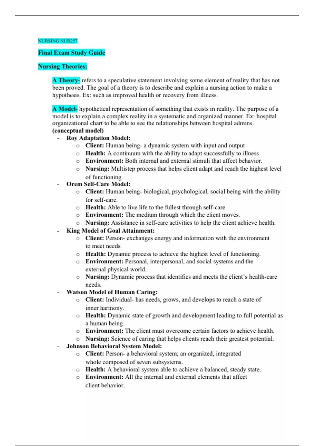 NURSING NUR257 Final Exam Study Guide Nursing Theories: A Theory- refers to a speculative statement involving some element of reality that has not been proved. The goal of a theory is to describe and explain a nursing action to make a hypothesis. Ex: such as improved health or recovery from illness. A Model- hypothetical representation of something that exists in reality. The purpose of a model is to explain a complex reality in a systematic and organized manner. Ex: hospital organizational chart to be able to see the relationships between hospital admins. (conceptual model) - Roy Adaptation Model: o Client: Human being- a dynamic system with input and output o Health: A continuum with the ability to adapt successfully to illness o Environment: Both internal and external stimuli that affect behavior. o Nursing: Multistep process that helps client adapt and reach the highest level of functioning. - Orem Self-Care Model: o Client: Human being- biological, psychological, social being with the ability for self-care. o Health: Able to live life to the fullest through self-care o Environment: The medium through which the client moves. o Nursing: Assistance in self-care activities to help the client achieve health. - King Model of Goal Attainment: o Client: Person- exchanges energy and information with the environment to meet needs. o Health: Dynamic process to achieve the highest level of functioning. o Environment: Personal, interpersonal, and social systems and the external physical world. o Nursing: Dynamic process that identifies and meets the client’s health-care needs. - Watson Model of Human Caring: o Client: Individual- has needs, grows, and develops to reach a state of inner harmony. o Health: Dynamic state of growth and development leading to full potential as a human being. o Environment: The client must overcome certain factors to achieve health. o Nursing: Science of caring that helps clients reach their greatest potential. - Johnson Behavioral System Model: o Client: Person- a behavioral system; an organized, integrated whole composed of seven subsystems. o Health: A behavioral system able to achieve a balanced, steady state. o Environment: All the internal and external elements that affect client behavior. o Nursing: Activities that manipulate the environment and help clients achieve the balanced state of health. - Neuman Health-Care Systems Model: o Client: An open system that constantly interacts with internal and external environments. o Health: An individual with relatedly stable internal functioning of a high state of wellness (stability). o Environment: Internal and external stressors that produce change in the client. o Nursing: Identifies boundary disruption and helps clients in activities to restore stability. • Orem Self Care: What is self-care? What are the two levels of self-care? What is wholly compensated care? What is partially compensated care? What is supportive developmental care? - Orem Self Care: (CHEN) - What is self-care? o Dorothea E. Orem's model of nursing is based on the belief that health care is each individual's own responsibility. The aim of this model is to help clients direct and carry out activities that maintain or improve their health. - What are the two levels of self-care? o In the Orem model, self-care is a two-part concept. The first type of self-care is called universal self-care and includes those elements commonly found in everyday life that support and encourage normal human growth, development, and functioning. Individuals who are healthy, according to the Orem model, carry out the activities listed in order to maintain a state of health. To some degree, all of these elements are necessary activities in maintaining health through self-care. The second type of self-care comes into play when the individual is unable to conduct one or more of the six self-care activities. This second type of self-care is called health deviation self-care. Health deviation self-care includes those activities carried out by individuals who have diseases, injuries, physiological or psychological stress, or other health-care concerns. Activities such as seeking health care at an emergency department or clinic, entering a drug rehabilitation unit, joining a health club or weight- control program, or going to a physician's office fall into this category. - What is wholly compensated care? o A person who is able to carry out few or no self-care activities falls into the wholly compensated nursing care category. - What is partially compensated care? o Clients in the partially compensated category of nursing care can meet some to most of their self-care needs but still have certain self-care deficits that require nursing intervention. - What is supportive developmental care? o Clients who are able to meet all of their basic self-care needs require very few or no nursing interventions. Neuman Health-Care Systems Model: What are the three levels of interventions as described by this theory? Primary, secondary, tertiary. - Nursing's main concern in this model is either to identify stressors that will disrupt a defensive boundary in the future (prevention) or to identify a stressor that has already disrupted a defensive boundary, thereby producing instability (illness) The Neuman model is based on the nursing process and identifies three levels of intervention: primary, secondary, and tertiary. - The main goal of a primary intervention is to prevent possible symptoms that could be caused by environmental stressors. Teaching clients about stress management, giving immunizations, and encouraging aerobic exercise to prevent heart disease are examples of primary interventions. - A secondary intervention is aimed at treating symptoms that have already been produced by stressors. Many of the actions that nurses perform in the hospital or clinic (e.g., giving pain medications or teaching a client with cardiac disease about the benefits of a low-sodium diet) fall into thi