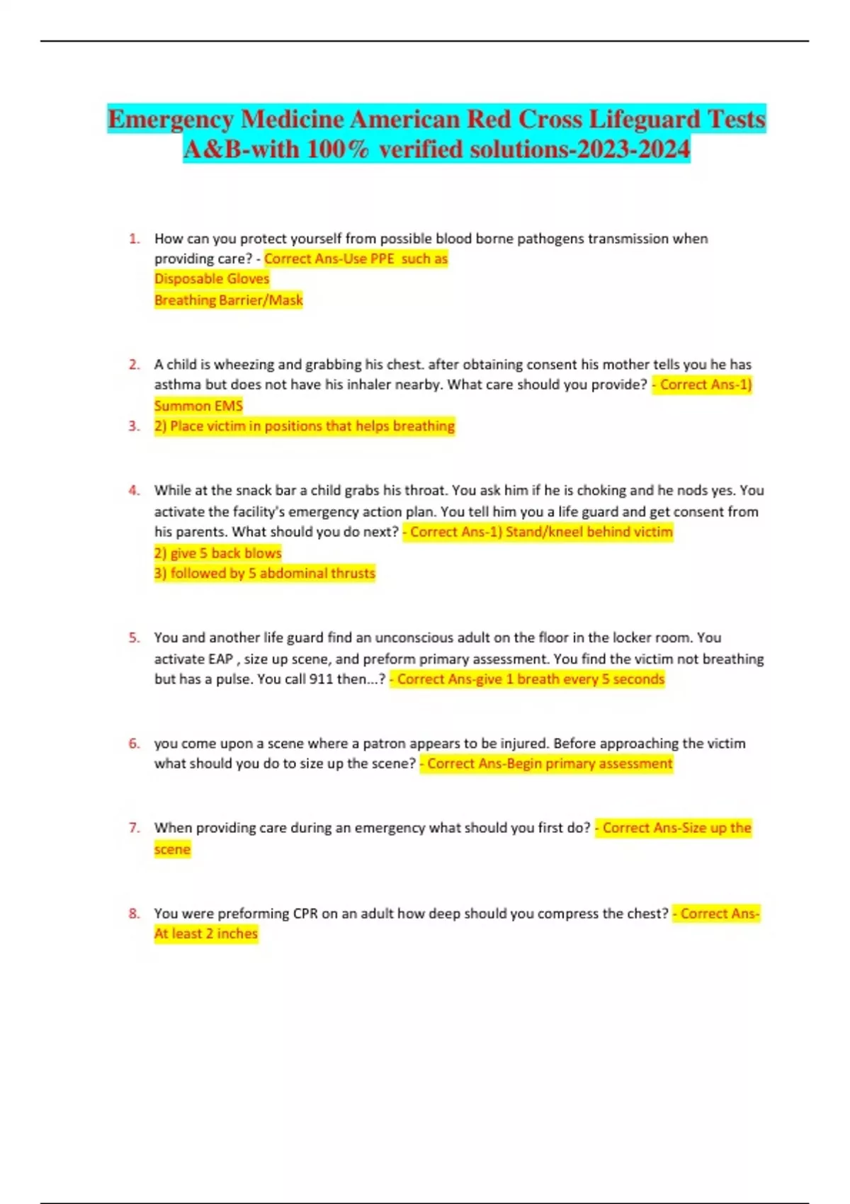 ACTUAL Emergency Medicine American Red Cross Lifeguard Tests A&B-with 100% verified solutions-2023-202