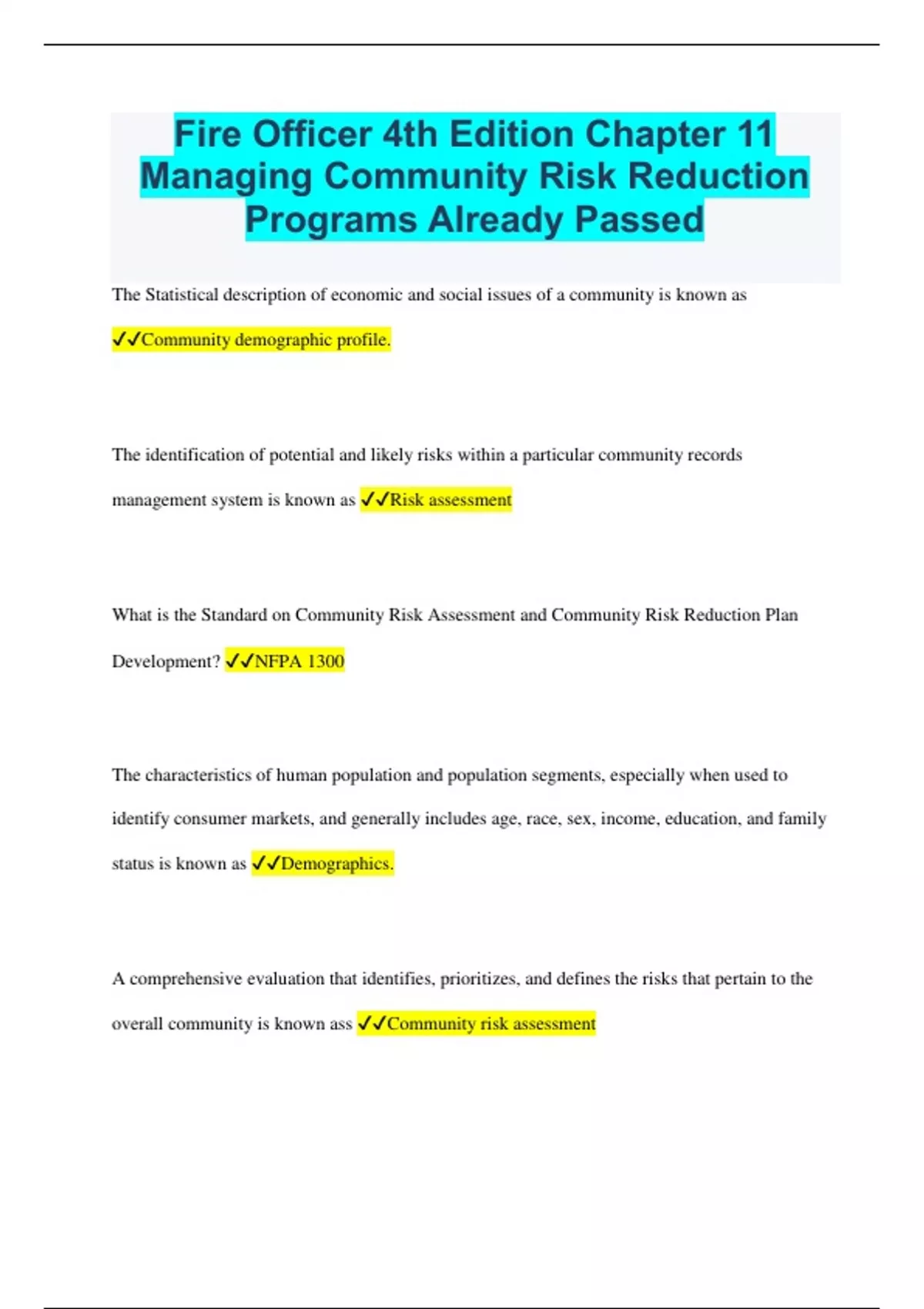 Fire Officer 4th Edition Chapter 11 Managing Community Risk Reduction Programs Already Passed The Statistical description of economic and social issues of a community is known as Community demographic profile. The identification of potential and likely risks within a particular community records management system is known as Risk assessment What is the Standard on Community Risk Assessment and Community Risk Reduction Plan Development? NFPA 1300 The characteristics of human population and population segments, especially when used to identify consumer markets, and generally includes age, race, sex, income, education, and family status is known as Demographics. A comprehensive evaluation that identifies, prioritizes, and defines the risks that pertain to the overall community is known ass Community risk assessment A process to identify and prioritize local risks, followed by the integrated and strategic investment of resources to reduce their occurrence and impact is known as Community risk reduction. A significant source for community profile data can be found on A) The U.S. Census Bureau website. B) Explore census website. A and B ___ Is a coalition of national organizations that are developing strategies for fire loss prevention, identify these elements when developing a community demographic profile. Vision 20/20 A frequency analysis performed by the U.S. geological survey to identify the 1% probability that a given event will be equaled or exceeded in any given year is known as the 100 year flood Building stock evaluation is an important tool when evaluating a community's risk due to natural disasters such as windstorms, earthquakes, and floods. Evaluation of building stock includes which of the following? A) Housing density and housing age. B) High density structures. C) Little crowded. ALL THE ABOVE What is the standard for the organization and deployment of fire suppression operations, emergency medical operations, and special operations to the public by CAREER fire departments? NFPA 1710 What is the standard for the organization and deployment of fire suppression operations, emergency medical operations, and special operations to the public by VOLUNTEER fire departments? NFPA 1720 According to Stouffer (2016), those at risk in the community would include all but which of the following? School-aged children ___ defines a target hazard as "... facilities in either the public or private sector that provide essential products and services to the general public, are otherwise necessary to preserve the welfare and quality of life in the community, or fulfill important public safety, emergency response, and/or disaster recovery functions." FEMA Vision 20/20 provides three qualitative tools to determine the likelihood and impact of a risk. If a risk was quantified as a "C" the risk likelihood would be Possible: Very few incidents in associated organizations or comparable facilities. What would vision 20/20 classify the risk consequence of the impact of one? Insignificant What would vision 20/20 classify the risk consequence of the impact of five? Catastrophic Analyzing the combination of risk likelihood and risk consequences of impact allows the fire officer to determine the category of risk. Which risk category would be best described if planning is required by the fire chief, and some action is required to reduce the consequences or likelihood? High risk Which risk category would be best described if a specific target hazard or critical facility response and monitoring is required? Moderate Risk Which risk category would be best described if the risk can be managed routine procedures? Low risk Which risk category would be best described if detailed research and risk management planning is required by the executive officers? Extreme Risk A community standard for the acceptable level of risk that citizens and government can tolerate and afford is known as Acceptable level of risk The National Fire Academy advocates "The Five E's of Prevention," which include education, engineering, and ALL BUT which of the following? Environment Which of the NFA's "Five E's," involves incentives that are measures used to influence behavior either positively or negatively? Economic Which of the NFA's "Five E's," involves interventions that are used by first responders to mitigate risk? Emergency Response Which of the NFA's "Five E's," involves interventions that influence the behavior by raising awareness and providing information and knowledge to produce the desired behavior? Education Which of the NFA's "Five E's," involves interventions that include passing, strengthening, and enforcing laws, as well as issuing and enforcing regulations? Enforcement The CRR (community risk reduction) is a document developed by the community, usually written by The agency that is leading the activities The completed CRR plan A) Identifies the goals. B) Partners. C) Activities and anticipated outcomes. ALL THE ABOVE A detailed report of the CRR plan that includes description of the implementation and analysis of efficiency and effectiveness shall be provided to the appropriate agencies, partners, and stakeholders for review Annually Providing information to the news media should be A normal occurrence. The NFPA publication recommends three steps when working with the media. They would include all of the following EXCEPT- Own the story Looking at the fire departments relationship with the media as a business arrangement would be an example of which of the following NFPA recommendations? Build a strong foundation The most important media asset a fire department has is a Good relationship with the media. Fire officer Jim says that whatever else you do, always tell the truth to the media. Fire officer Paul says members of the news media need to be familiar with you and need to be comfortable working with you. Who is correct? Both are correct All of the following would be appropriate statements to be released to the media EXCE