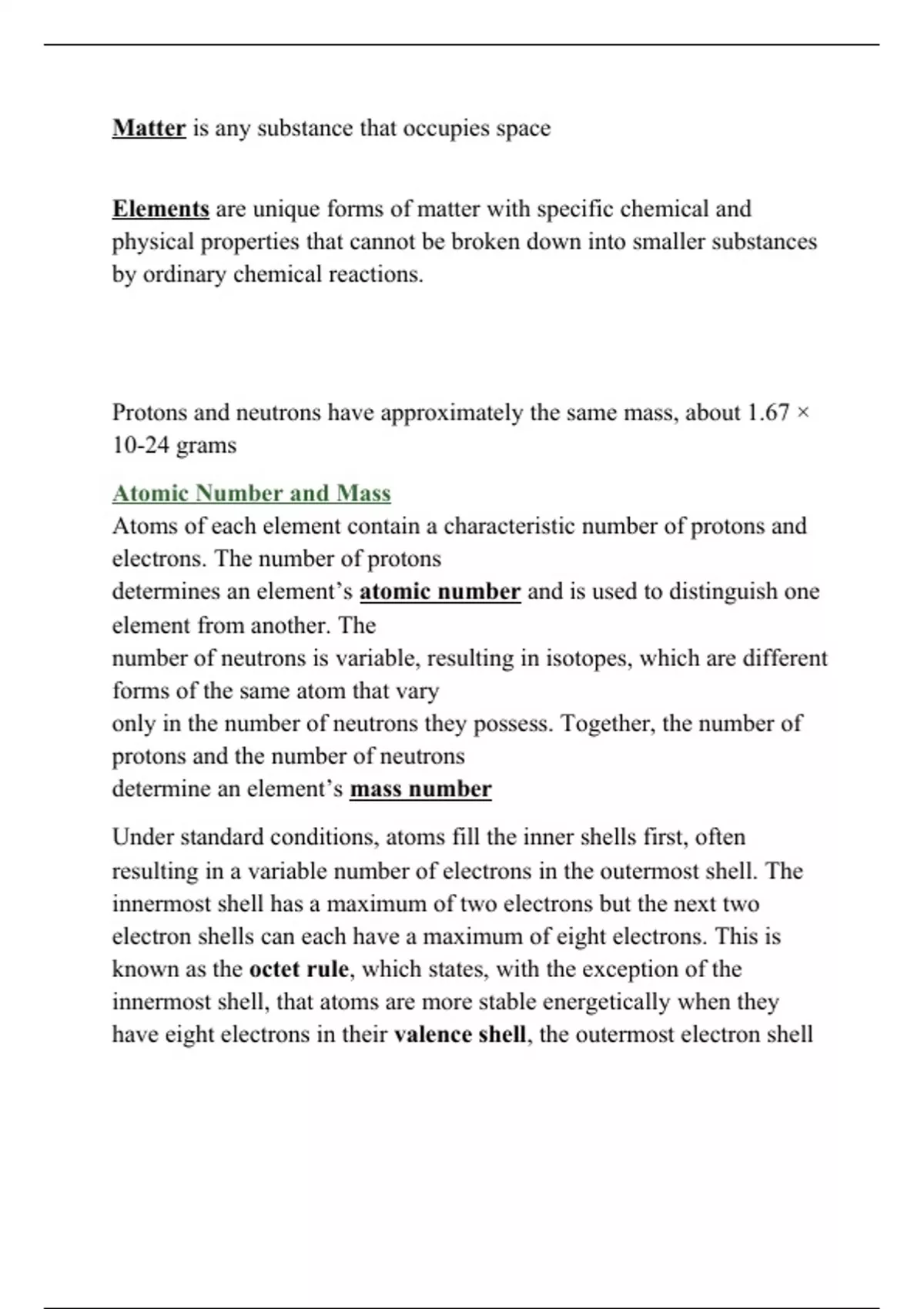 Matter is any substance that occupies space Elements are unique forms of matter with specific chemical and physical properties that cannot be broken down into smaller substances by ordinary chemical reactions.