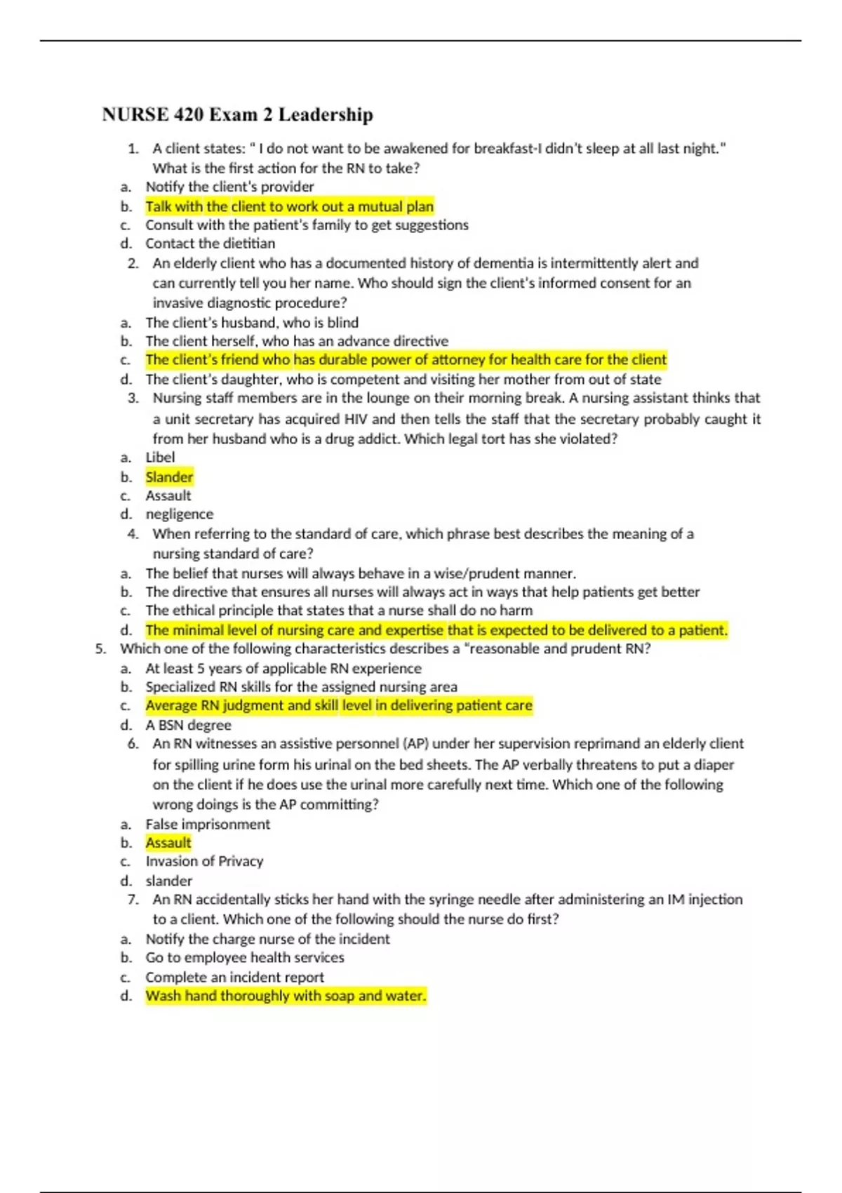 NURSE 420 Exam 2 Leadership 1. A client states: “ I do not want to be awakened for breakfast-I didn’t sleep at all last night.” What is the first action for the RN to take? a. Notify the client’s provider b. Talk with the client to work out a mutual plan c. Consult with the patient’s family to get suggestions d. Contact the dietitian 2. An elderly client who has a documented history of dementia is intermittently alert and can currently tell you her name. Who should sign the client’s informed consent for an invasive diagnostic procedure? a. The client’s husband, who is blind b. The client herself, who has an advance directive c. The client’s friend who has durable power of attorney for health care for the client d. The client’s daughter, who is competent and visiting her mother from out of state 3. Nursing staff members are in the lounge on their morning break. A nursing assistant thinks that a unit secretary has acquired HIV and then tells the staff that the secretary probably caught it from her husband who is a drug addict. Which legal tort has she violated? a. Libel b. Slander c. Assault d. negligence 4. When referring to the standard of care, which phrase best describes the meaning of a nursing standard of care? a. The belief that nurses will always behave in a wise/prudent manner. b. The directive that ensures all nurses will always act in ways that help patients get better c. The ethical principle that states that a nurse shall do no harm d. The minimal level of nursing care and expertise that is expected to be delivered to a patient. 5. Which one of the following characteristics describes a “reasonable and prudent RN? a. At least 5 years of applicable RN experience b. Specialized RN skills for the assigned nursing area c. Average RN judgment and skill level in delivering patient care d. A BSN degree 6. An RN witnesses an assistive personnel (AP) under her supervision reprimand an elderly client for spilling urine form his urinal on the bed sheets. The AP verbally threatens to put a diaper on the client if he does use the urinal more carefully next time. Which one of the following wrong doings is the AP committing? a. False imprisonment b. Assault c. Invasion of Privacy d. slander 7. An RN accidentally sticks her hand with the syringe needle after administering an IM injection to a client. Which one of the following should the nurse do first? a. Notify the charge nurse of the incident b. Go to employee health services c. Complete an incident report d. Wash hand thoroughly with soap and water. 8. An RN notes that the toes on the casted left foot of her post-surgical client are cold and turning blue. The RN has notified the healthcare provides’ answering service every hour for the past two hours, yet the healthcare provider has not yet responded to the calls. The client is now complaining to extreme pain. What is the most important action for the nurse to take right now? a. Continue to call the healthcare provider’s answering service every 15 minutes until a response is obtained. b. Report the situation to the nursing supervisor so she can elevate the patient’s situation to the appropriate head/chief physician for the service. c. Continue to record the assessment finding, the time of each phone call and content reported each time to the healthcare provider d. Have the family file an immediate complaint with the Medical Staff Office against the physician. 9. Which statement best describes the value of clinical pathways (also known as care paths or critical pathways)? a. They provide a means of standardizing care for clients with similar diagnoses. b. They determine justifiable differences/variances among clients c. They decrease the amount of paperwork required for reimbursement d. They reduce administrative costs. 10. An RN overhears two care providers discussing a hospitalized client while getting coffee at the coffee bar in hospital lobby where many visitors can hear them. Which nursing action below is most appropriate for the RN to take first? a. Report the incident to their nurse manager b. Quickly engage them in a different conversation to change the subject. c. Quietly pull the two staf f members aside and remind them about client confidentiality. d. Wait until they get their coffee and head back to the nursing lounge; then tell the care providers that the conversation was not appropriate. 11. A client who is admitted for suspected abuse is quiet and withdrawn. Which of the following should the nurse implement to promote client communication? a. Invite a family member to be present for the nursing history b. Provide basic wound care for obvious physical injuries c. Probe the client to offer an actual account of the abuse d. Provide privacy and be direct and honest when communicating with the client 12. Which behavior is a priority to minimize an RN’s risk for a malpractice claim? a. Maintain positive nurse-patient relationships b. Function within the state’s nursing practice act. c. Maintain sufficient professional liability insurance to cover you if you are sued d. Ask for assistance from other RNs when engaged in high risk procedures 13. A RN in the emergency department is assessing an elderly client. The client’s son states that the client has glaucoma, is extremely hard of hearing, and has been experiencing severe abdominal cramping and diarrhea for the past 24 hours. Which of the following actions is most appropriate for the nurse to do first? a. Ask the client if he is wearing or has with him a hearing aid b. Ask the patient if he has taken any medication for the diarrhea in the past 24 hours c. Using a numeric 1-10 rating scale, ask the client to rate his abdominal pain d. Ask the client if he has talked to his physician yet about his condition. 14. Which of the following is a principle of ethical decision making that refers to the idea of doing “good”? a. Fidelity b. Beneficence c. Veracity d. Justice 15. The expense of buying a new MR