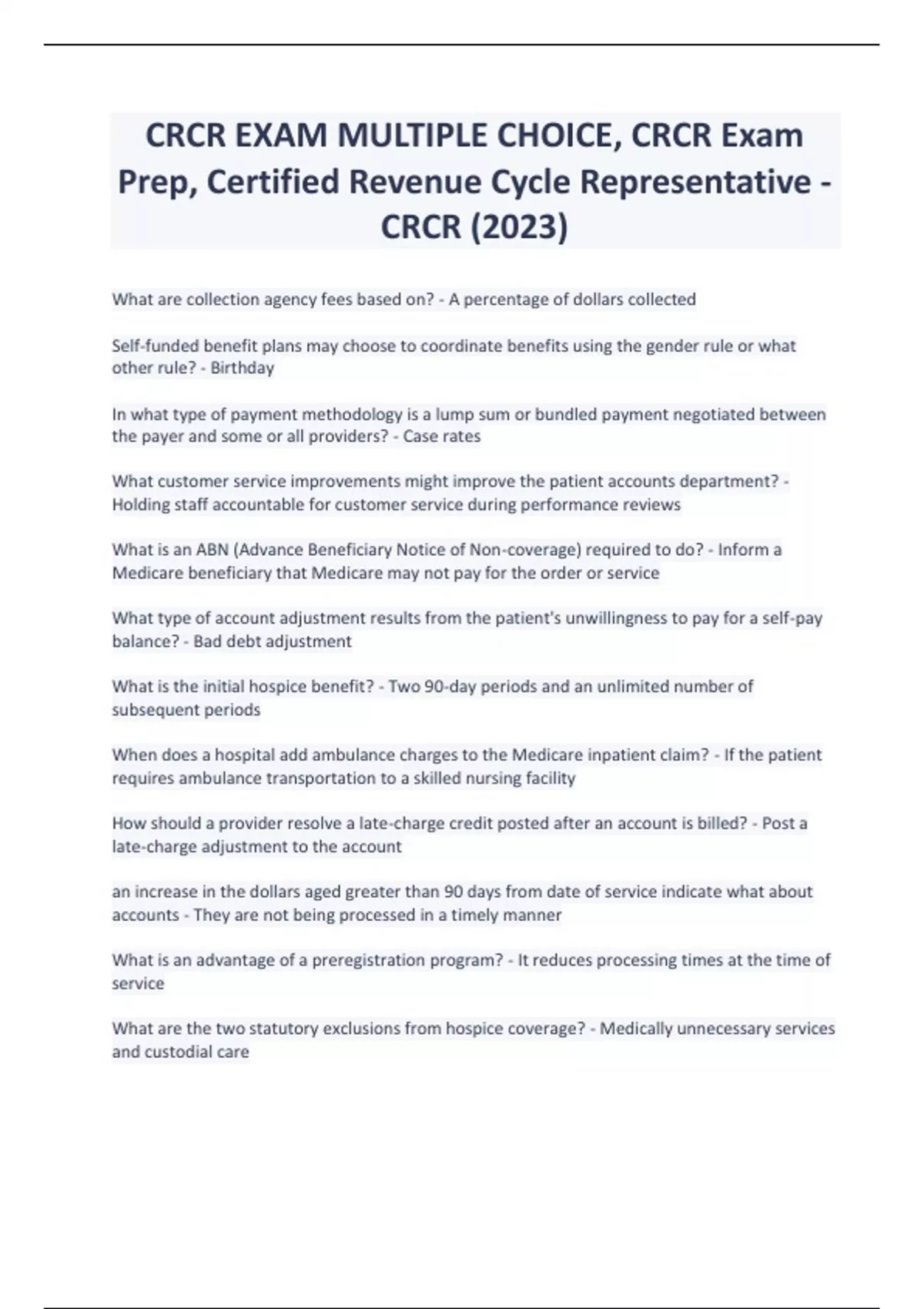 CRCR EXAM MULTIPLE CHOICE, CRCR Exam Prep, Certified Revenue Cycle Representative - CRCR