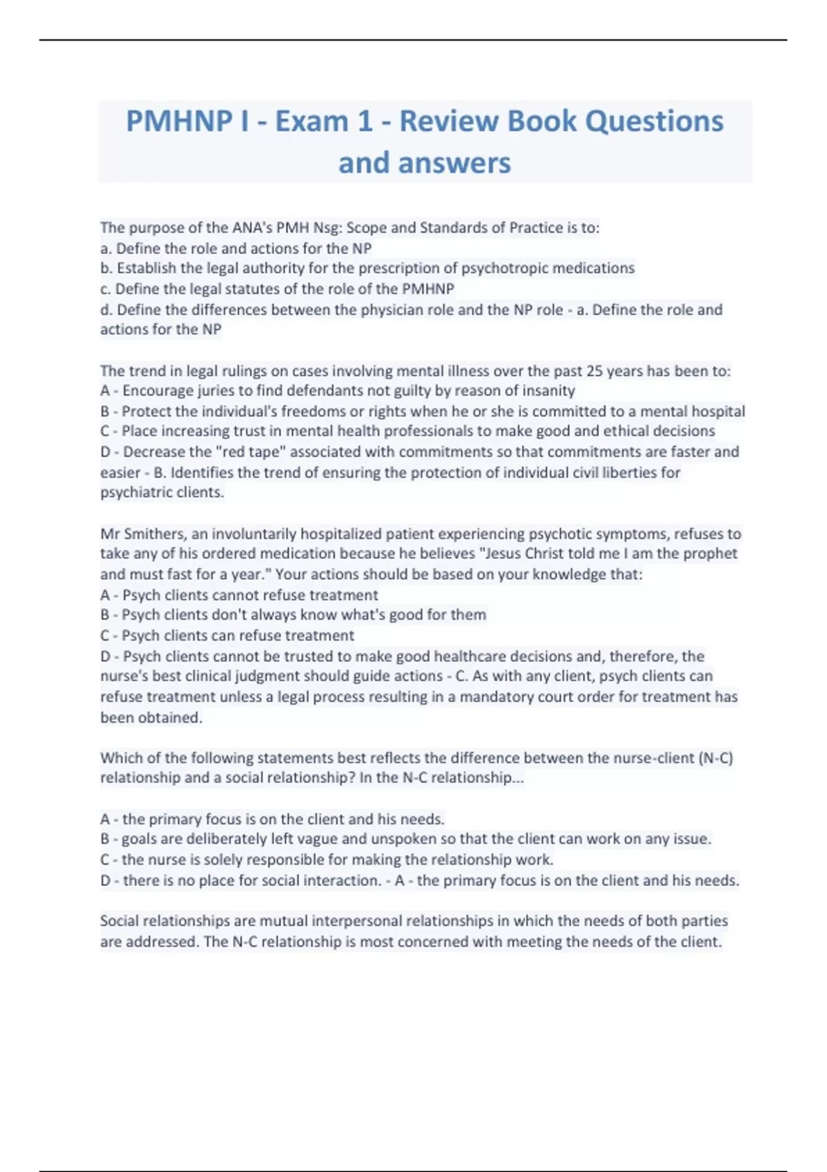 PMHNP I - Exam 1 - Review Book Questions and answers
