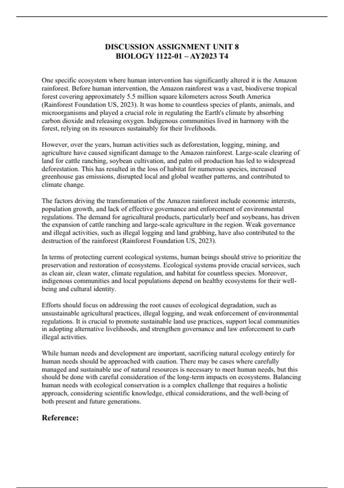 One specific ecosystem where human intervention has significantly altered it is the Amazon rainforest. Before human intervention, the Amazon rainforest was a vast, biodiverse tropical forest covering approximately 5.5 million square kilometers across South America (Rainforest Foundation US, 2023). It was home to countless species of plants, animals, and microorganisms and played a crucial role in regulating the Earth's climate by absorbing carbon dioxide and releasing oxygen. Indigenous communities lived in harmony with the forest, relying on its resources sustainably for their livelihoods.
