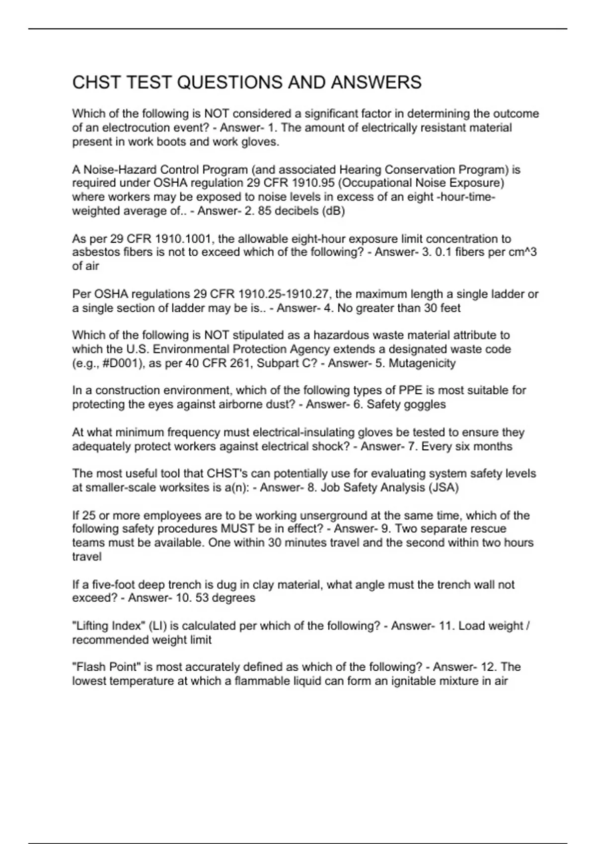 Which of the following is NOT considered a significant factor in determining the outcome of an electrocution event? - Answer- 1. The amount of electrically resistant material present in work boots and work gloves. A Noise-Hazard Control Program (and associated Hearing Conservation Program) is required under OSHA regulation 29 CFR 1910.95 (Occupational Noise Exposure) where workers may be exposed to noise levels in excess of an eight -hour-time-weighted average of.. - Answer- 2. 85 decibels (dB) As per 29 CFR 1910.1001, the allowable eight-hour exposure limit concentration to asbestos fibers is not to exceed which of the following? - Answer- 3. 0.1 fibers per cm^3 of air Per OSHA regulations 29 CFR 1910.25-1910.27, the maximum length a single ladder or a single section of ladder may be is.. - Answer- 4. No greater than 30 feet Which of the following is NOT stipulated as a hazardous waste material attribute to which the U.S. Environmental Protection Agency extends a designated waste code (e.g., #D001), as per 40 CFR 261, Subpart C? - Answer- 5. Mutagenicity In a construction environment, which of the following types of PPE is most suitable for protecting the eyes against airborne dust? - Answer- 6. Safety goggles At what minimum frequency must electrical-insulating gloves be tested to ensure they adequately protect workers against electrical shock? - Answer- 7. Every six months The most useful tool that CHST's can potentially use for evaluating system safety levels at smaller-scale worksites is a(n): - Answer- 8. Job Safety Analysis (JSA) If 25 or more employees are to be working unserground at the same time, which of the following safety procedures MUST be in effect? - Answer- 9. Two separate rescue teams must be available. One within 30 minutes travel and the second within two hours travel If a five-foot deep trench is dug in clay material, what angle must the trench wall not exceed? - Answer- 10. 53 degrees "Lifting Index" (LI) is calculated per which of the following? - Answer- 11. Load weight / recommended weight limit "Flash Point" is most accurately defined as which of the following? - Answer- 12. The lowest temperature at which a flammable liquid can form an ignitable mixture in air
