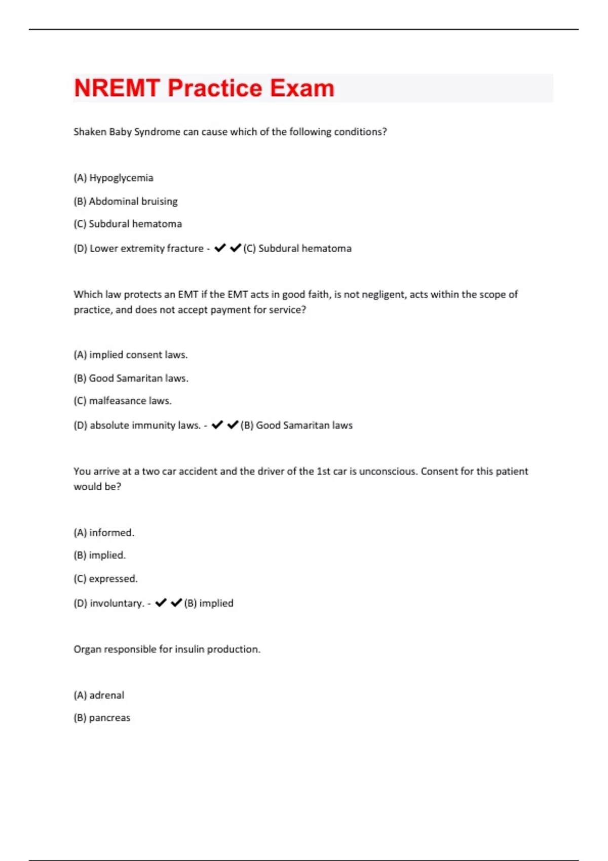 Shaken Baby Syndrome can cause which of the following conditions? (A) Hypoglycemia (B) Abdominal bruising (C) Subdural hematoma (D) Lower extremity fracture - (C) Subdural hematoma Which law protects an EMT if the EMT acts in good faith, is not negligent, acts within the scope of practice, and does not accept payment for service? (A) implied consent laws. (B) Good Samaritan laws. (C) malfeasance laws. (D) absolute immunity laws. - (B) Good Samaritan laws You arrive at a two car accident and the driver of the 1st car is unconscious. Consent for this patient would be? (A) informed. (B) implied. (C) expressed. (D) involuntary. - (B) implied Organ responsible for insulin production. (A) adrenal (B) pancreas(C) thyroid (D) thymus - (B) pancreas Which federal agency regulates telecommunications in the United States? (A) FBI. (B) FDIC. (C) FCC. (D) FACEP. - (C) FCC.