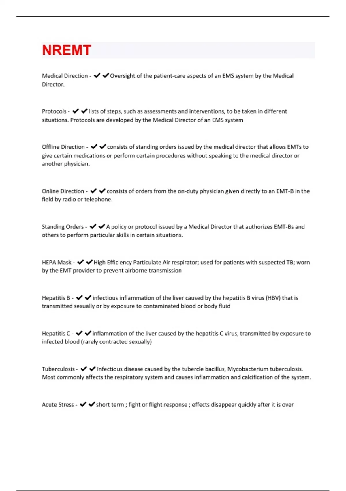Medical Direction - Oversight of the patient-care aspects of an EMS system by the Medical Director. Protocols - lists of steps, such as assessments and interventions, to be taken in different situations. Protocols are developed by the Medical Director of an EMS system Offline Direction - consists of standing orders issued by the medical director that allows EMTs to give certain medications or perform certain procedures without speaking to the medical director or another physician. Online Direction - consists of orders from the on-duty physician given directly to an EMT-B in the field by radio or telephone. Standing Orders - A policy or protocol issued by a Medical Director that authorizes EMT-Bs and others to perform particular skills in certain situations. HEPA Mask - High Efficiency Particulate Air respirator; used for patients with suspected TB; worn by the EMT provider to prevent airborne transmission Hepatitis B - infectious inflammation of the liver caused by the hepatitis B virus (HBV) that is transmitted sexually or by exposure to contaminated blood or body fluid Hepatitis C - inflammation of the liver caused by the hepatitis C virus, transmitted by exposure to infected blood (rarely contracted sexually) Tuberculosis - Infectious disease caused by the tubercle bacillus, Mycobacterium tuberculosis. Most commonly affects the respiratory system and causes inflammation and calcification of the system. Acute Stress - short term ; fight or flight response ; effects disappear quickly after it is overScope of Practice - What we are allowed to do or trained to do