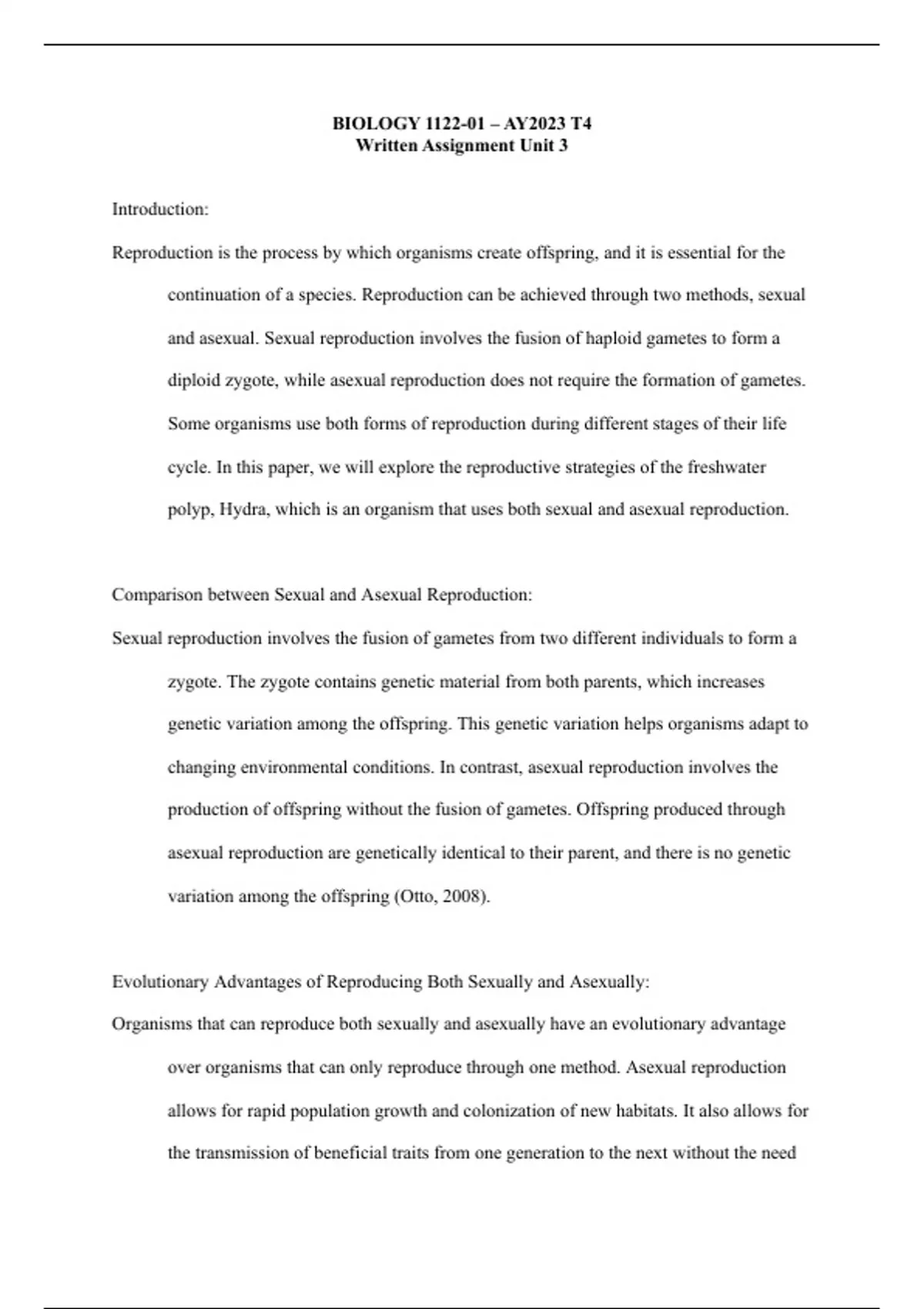 Reproduction is the process by which organisms create offspring, and it is essential for the continuation of a species. Reproduction can be achieved through two methods, sexual and asexual. Sexual reproduction involves the fusion of haploid gametes to form a diploid zygote, while asexual reproduction does not require the formation of gametes. Some organisms use both forms of reproduction during different stages of their life cycle. In this paper, we will explore the of the freshwater polyp, Hydra, which is an organism that uses both sexual and asexual reproduction.
