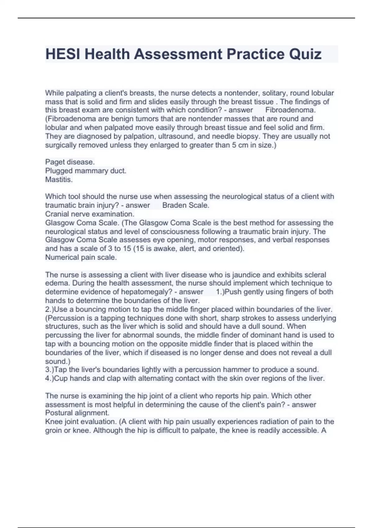HESI Health Assessment Practice Quiz Questions with correct Answers 2023
