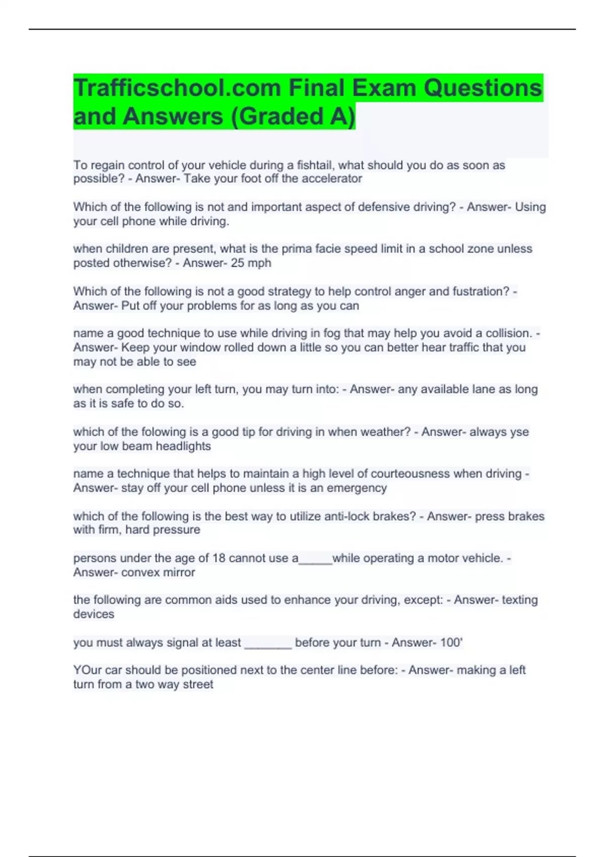 Trafficschool.com Final Exam Questions and Answers (Graded A)