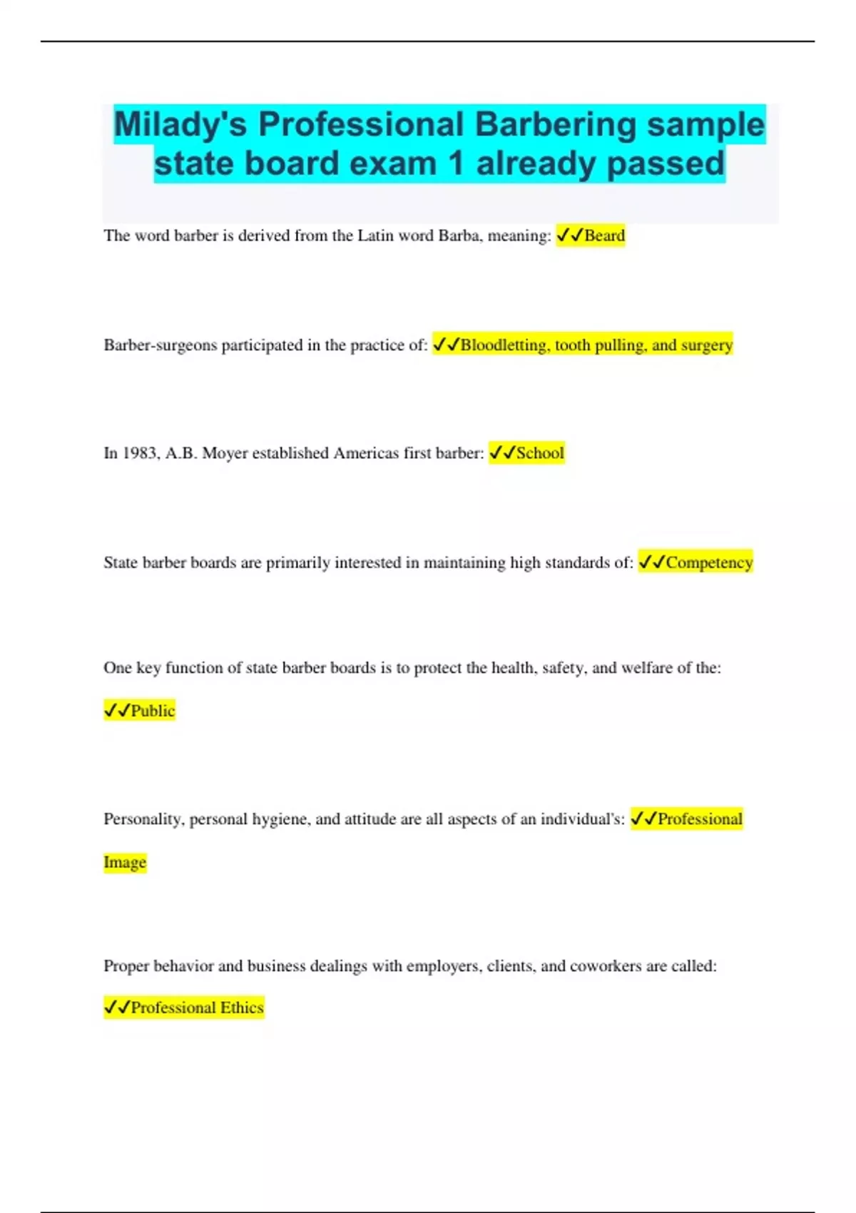 Milady's Professional Barbering sample state board exam 1 already passed
