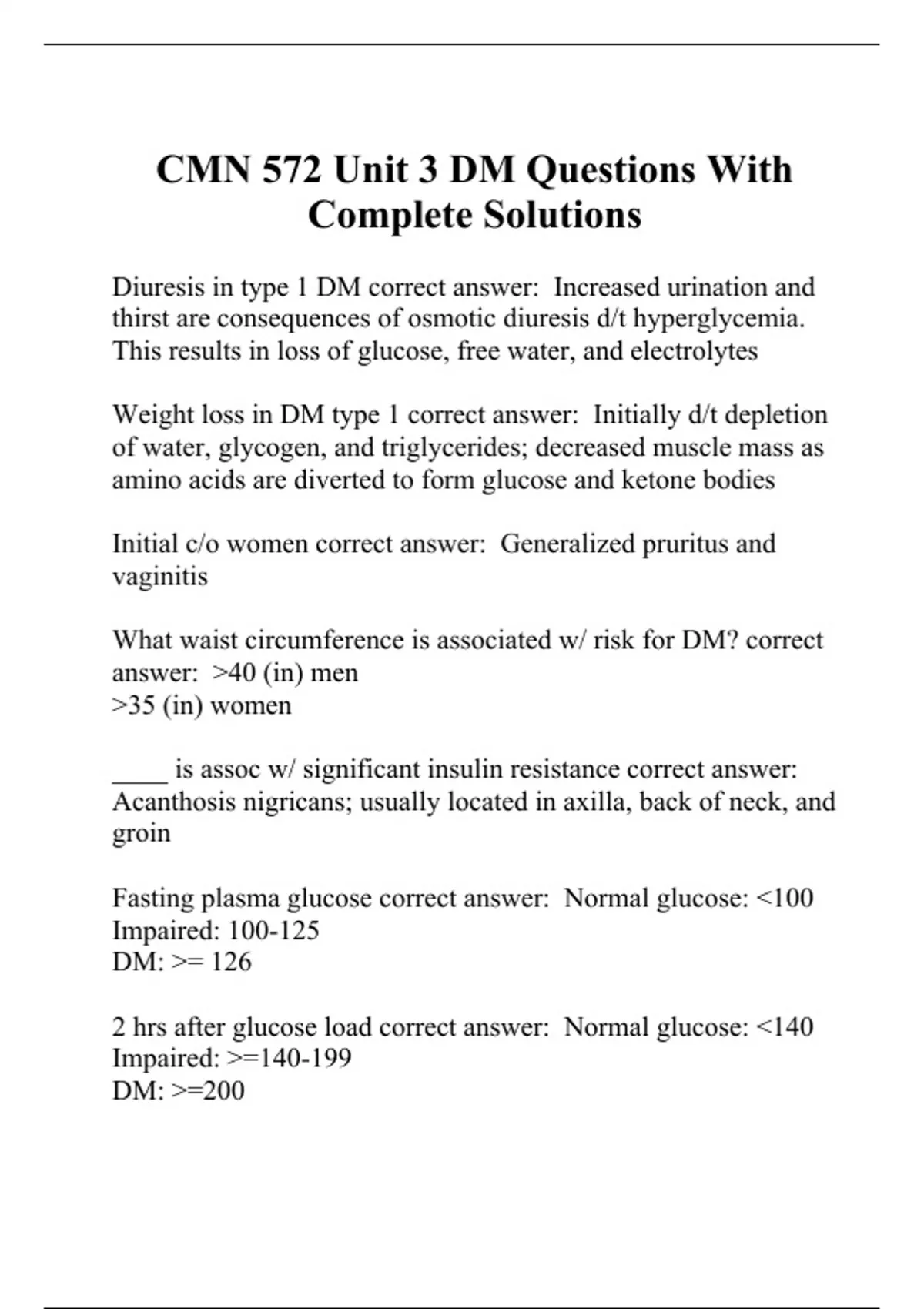 Diuresis in type 1 DM correct answer: Increased urination and thirst are consequences of osmotic diuresis d/t hyperglycemia. This results in loss of glucose, free water, and electrolytes Weight loss in DM type 1 correct answer: Initially d/t depletion of water, glycogen, and triglycerides; decreased muscle mass as amino acids are diverted to form glucose and ketone bodies Initial c/o women correct answer: Generalized pruritus and vaginitis What waist circumference is associated w/ risk for DM? correct answer: 40 (in) men 35 (in) women ____ is assoc w/ significant insulin resistance correct answer: Acanthosis nigricans; usually located in axilla, back of neck, and groin Fasting plasma glucose correct answer: Normal glucose: 100 Impaired: 100-125 DM: = 126 2 hrs after glucose load correct answer: Normal glucose: 140 Impaired: =140-199 DM: =200 HbA1c correct answer: Normal: 5.7 Impaired: 5.7-6.4 DM: =6.5 Advantages of using HbA1c as diagnostic tool for DM correct answer: -no need to fast -lower individual variability than OGTT and fasting test -provides an estimate of glucose control for the past 2-3 mo Why is a HbA1c of 6.5% the cutoff value for DM dx? correct answer: The risk of retinopathy increases substantially above this value Dx of DM correct answer: -A1c = 6.5% -FPG =126 -2-hr OGTT =200 -Classic symptoms of hyperglycemia/crisis w/ random PG
