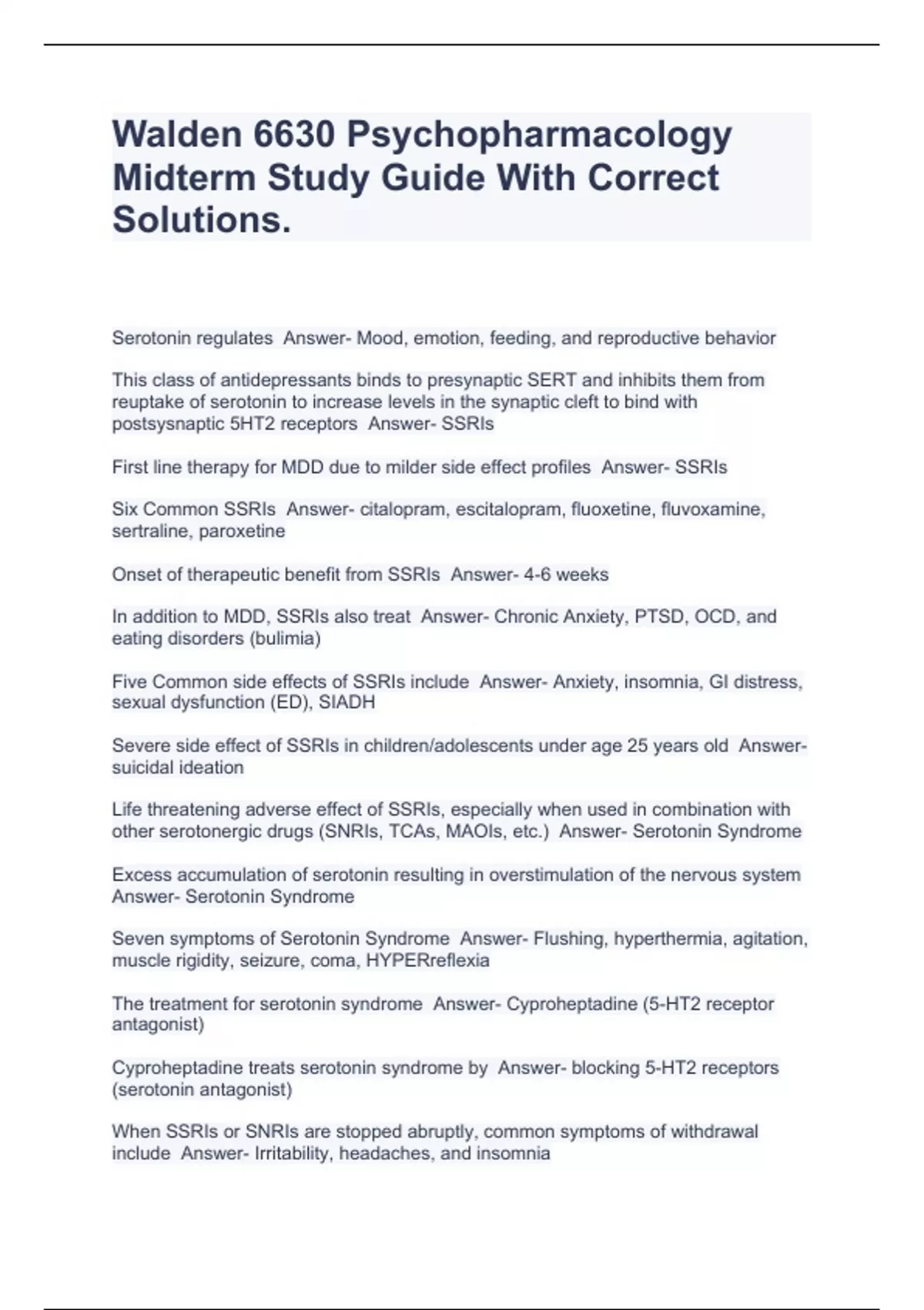 Walden 6630 Psychopharmacology Midterm Study Guide With Correct Solutions.