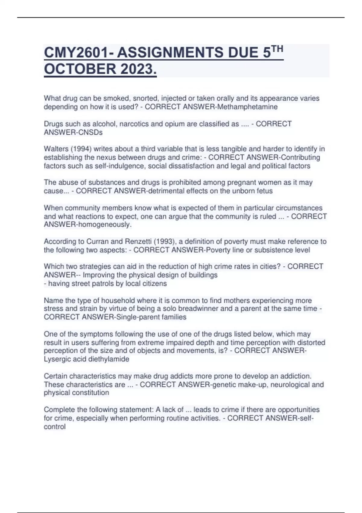 CMY2601- ASSIGNMENTS DUE 5TH OCTOBER 2023. What drug can be smoked, snorted, injected or taken orally and its appearance varies depending on how it is used? - CORRECT ANSWER-Methamphetamine Drugs such as alcohol, narcotics and opium are classified as .... - CORRECT ANSWER-CNSDs Walters (1994) writes about a third variable that is less tangible and harder to identify in establishing the nexus between drugs and crime: - CORRECT ANSWER-Contributing factors such as self-indulgence, social dissatisfaction and legal and political factors The abuse of substances and drugs is prohibited among pregnant women as it may cause... - CORRECT ANSWER-detrimental effects on the unborn fetus When community members know what is expected of them in particular circumstances and what reactions to expect, one can argue that the community is ruled ... - CORRECT ANSWER-homogeneously. According to Curran and Renzetti (1993), a definition of poverty must make reference to the following two aspects: - CORRECT ANSWER-Poverty