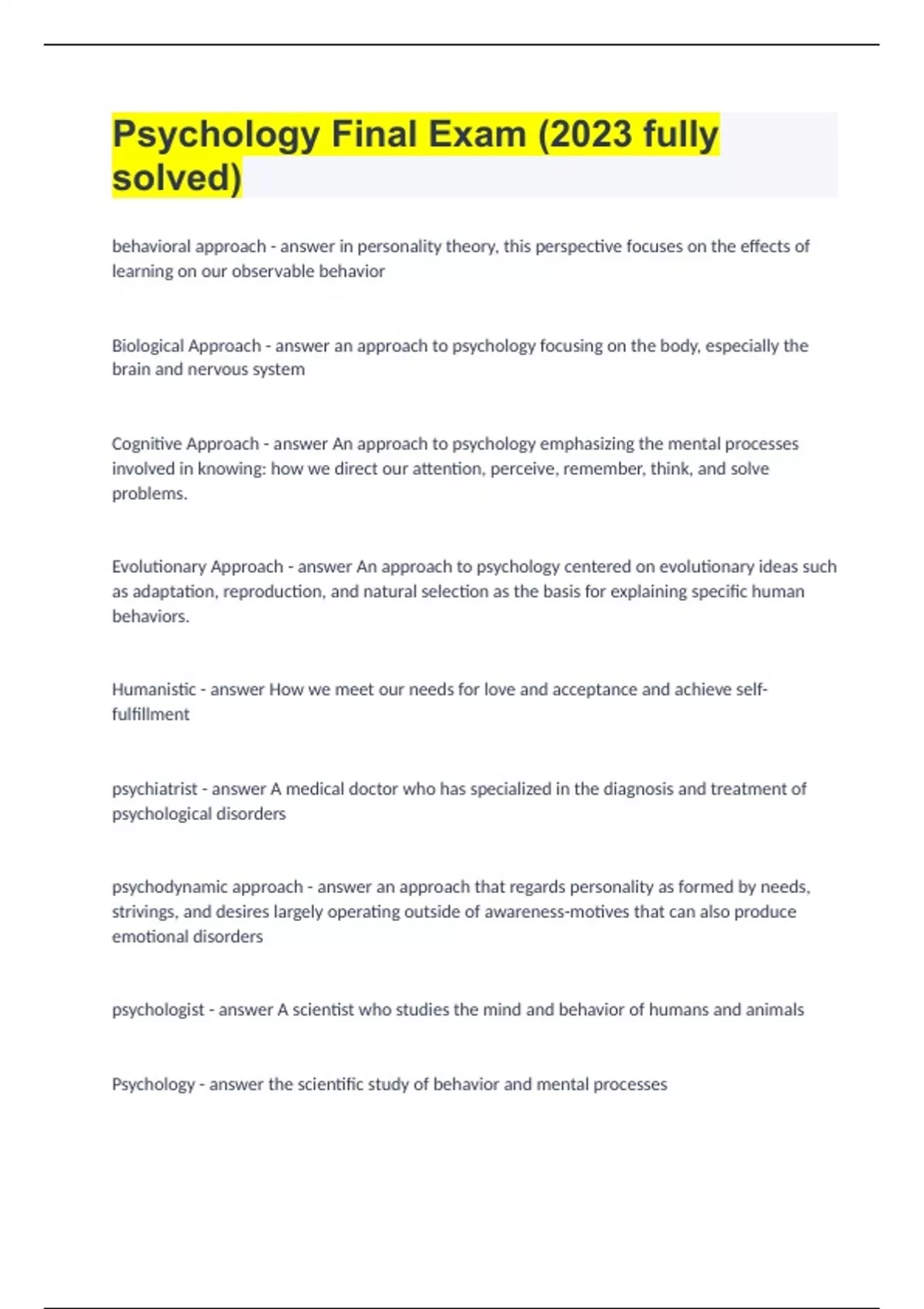 Psychology Final Exam (2023 fully solved & verified for accuracy)