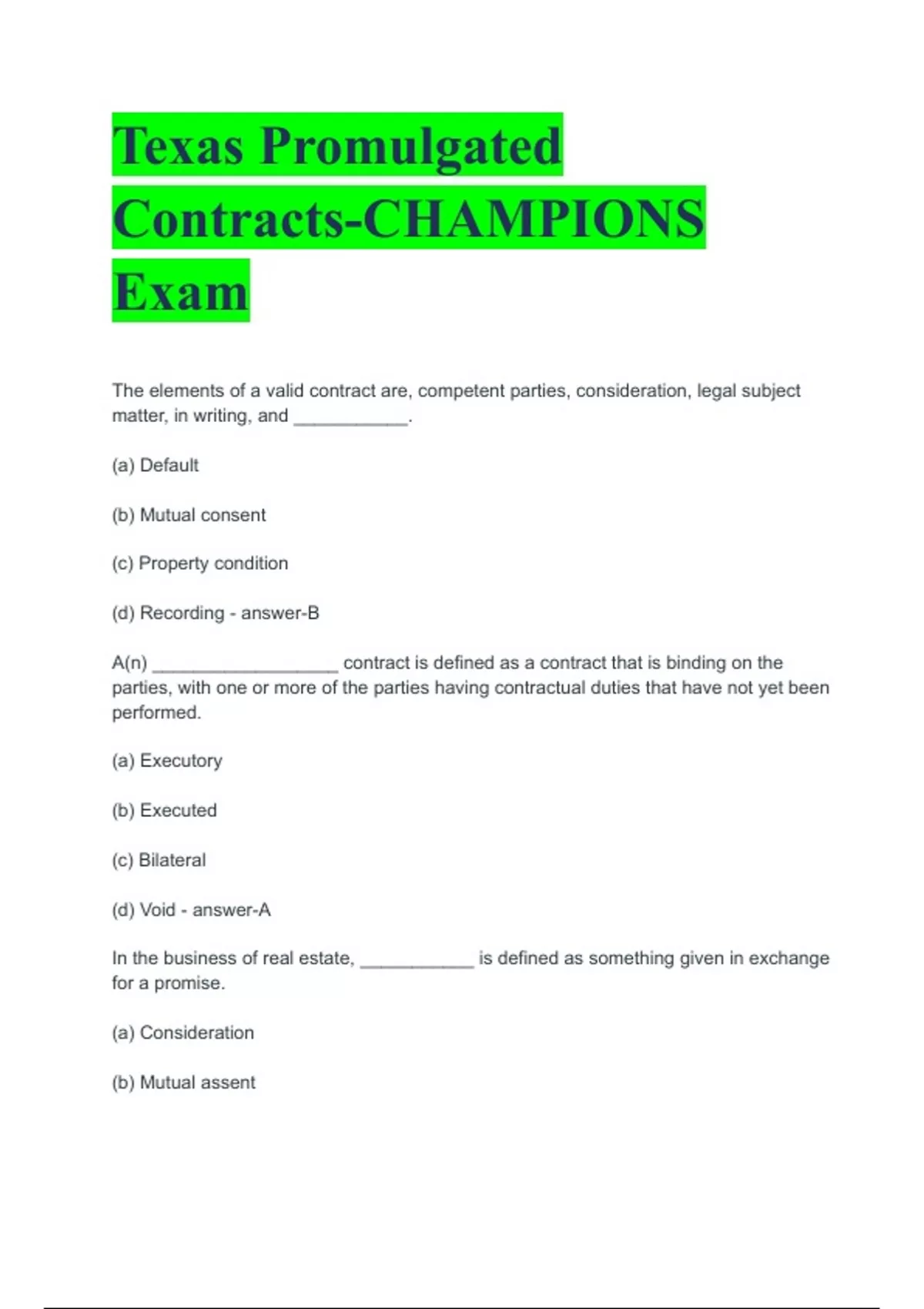 Texas Promulgated Contracts-CHAMPIONS Exam 2023 100% correct answers The elements of a valid contract are, competent parties, consideration, legal subject matter, in writing, and ___________. (a) Default (b) Mutual consent (c) Property condition (d) Recording - answer-B A(n) __________________ contract is defined as a contract that is binding on the parties, with one or more of the parties having contractual duties that have not yet been performed. (a) Executory (b) Executed (c) Bilateral (d) Void - answer-A