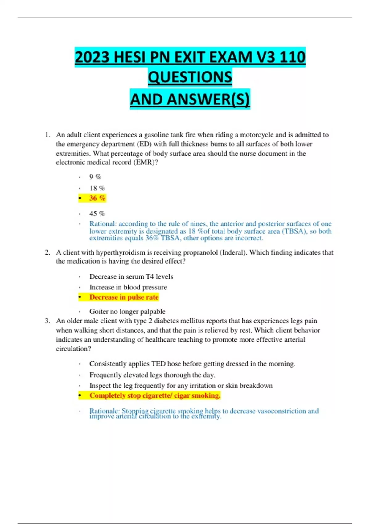 2023 HESI PN EXIT EXAM V3 110 QUESTIONS AND ANSWER(S) 1. An adult client experiences a gasoline tank fire when riding a motorcycle and is admitted to the emergency department (ED) with full thickness burns to all surfaces of both lower extremities. What percentage of body surface area should the nurse document in the electronic medical record (EMR)? • 9 % • 18 % • 36 % • 45 % • Rational: according to the rule of nines, the anterior and posterior surfaces of one lower extremity is designated as 18 %of total body surface area (TBSA), so both extremities equals 36% TBSA, other options are incorrect. 2. A client with hyperthyroidism is receiving propranolol (Inderal). Which finding indicates that the medication is having the desired effect? • Decrease in serum T4 levels • Increase in blood pressure • Decrease in pulse rate • Goiter no longer palpable 3. An older male client with type 2 diabetes mellitus reports that has experiences legs pain when walking short distances, and that the pain is relieved by rest. Which client behavior indicates an understanding of healthcare teaching to promote more effective arterial circulation? • Consistently applies TED hose before getting dressed in the morning. • Frequently elevated legs thorough the day. • Inspect the leg frequently for any irritation or skin breakdown • Completely stop cigarette/ cigar smoking. • Rationale: Stopping cigarette smoking helps to decrease vasoconstriction and improve arterial circulation to the extremity. 4. A community health nurse is concerned about the spread of communicable diseases among migrant farm workers in a rural community. What action should the nurse take to promote the success of a healthcare program designed to address this problem? • Establish trust with community leaders and respect cultural and family values 5. The nurse performs a prescribed neurological check at the beginning of the shift on a client who was admitted to the hospital with a subarachnoid brain attack (stroke). The client’s Glasgow Coma Scale (GCS) score is 9. What information is most important for the nurse to determine? • The client’s previous GCS score • When the client’s stroke symptoms started • If the client is oriented to time • The client’s blood pressure and respiration rate • Rationale: The normal GCS is 15, and it is most important for the nurse to determine if it abnormal score a sign of improvement or a deterioration in the client’s condition 6. The charge nurse in a critical care unit is reviewing clients’ conditions to determine who is stable enough to be transferred. Which client status report indicates readiness for transfer from the critical care unit to a medical unit? • Chronic liver failure with a hemoglobin of 10.1 and slight bilirubin elevation 7. Based on principles of asepsis, the nurse should consider which circumstance to be sterile? • One inch- border around the edge of the sterile field set up in the operating room • A wrapped unopened, sterile 4x4 gauze placed on a damp table top. • An open sterile Foley catheter kit set up on a table at the nurse waist level • Sterile syringe is placed on sterile area as the nurse riches over the sterile field. • Rationale: A sterile package at or above the waist level is considered sterile. The edge of sterile field is contaminated which include a 1-inch border (A). A sterile objects become contaminated by capillary action when sterile objects become in contact with a wet contaminated surface. 8. An unlicensed assistive personnel (UAP) reports that a client’s right hand and fingers spasms when taking the blood pressure using the same arm. After confirming the presence of spams what action should the nurse take? • Ask the UAP to take the blood pressure in the other arm • Tell the UAP to use a different sphygmomanometer. • Review the client’s serum calcium level • Administer PRN antianxiety medication. • Rationale: Trousseau’s sign is indicated by spasms in the distal portion of an extremity that is being used to measure blood pressure and is caused by hypocalcemia (normal level 9.0-10.5 mg/dl, so C should be implemented. 9. A 56-years-old man shares with the nurse that he is having difficulty making decision about terminating life support for his wife. What is the best initial action by the nurse? • Provide an opportunity for him to clarify his values related to the decision • Encourage him to share memories about his life with his wife and family • Advise him to seek several opinions before making decision • Offer to contact the hospital chaplain or social worker to offer support. • Rationale: When a client is faced with a decisional conflict, the nurse should first provide opportunities for the client to clarify values important in the decision. The rest may also be beneficial once the client as clarified the values that are important to him in the decision-making process. 10. A client is being discharged home after being treated for heart failure (HF). What instruction should the nurse include in this client’s discharge teaching plan? • Weigh every morning • Eat a high protein diet • Perform range of motion exercises • Limit fluid intake to 1,500 ml daily 11. A woman just learned that she was infected with Heliobacter pylori. Based on this finding, which health promotion practice should the nurse suggest? • Encourage screening for a peptic ulcer 12. A client who recently underwear a tracheostomy is being prepared for discharge to home. Which instructions is most important for the nurse to include in the discharge plan? • Teach tracheal suctioning techniques 13. A child with heart failure is receiving the diuretic furosemide (Lasix) and has serum potassium level 3.0 mEq/L. Which assessment is most important for the nurse to obtain? • Cardiac rhythm and heart rate. • Daily intake of foods rich in potassium. • Hourly urinary output • Thirst ad skin turgor. 14. The nur