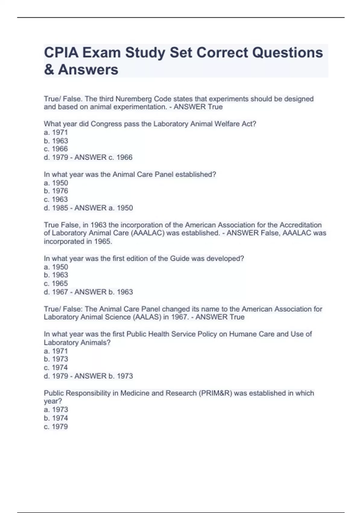 True/ False. The third Nuremberg Code states that experiments should be designed and based on animal experimentation. - ANSWER True What year did Congress pass the Laboratory Animal Welfare Act? a. 1971 b. 1963 c. 1966 d. 1979 - ANSWER c. 1966 In what year was the Animal Care Panel established? a. 1950 b. 1976 c. 1963 d. 1985 - ANSWER a. 1950 True False, in 1963 the incorporation of the American Association for the Accreditation of Laboratory Animal Care (AAALAC) was established. - ANSWER False, AAALAC was incorporated in 1965. In what year was the first edition of the Guide was developed? a. 1950 b. 1963 c. 1965 d. 1967 - ANSWER b. 1963 True/ False: The Animal Care Panel changed its name to the American Association for Laboratory Animal Science (AALAS) in 1967. - ANSWER True In what year was the first Public Health Service Policy on Humane Care and Use of Laboratory Animals? a. 1971 b. 1973 c. 1974 d. 1979 - ANSWER b. 1973 Public Responsibility in Medicine and Research (PRIM&R) was established in which year? a. 1973 b. 1974 c. 1979 d. 1982 - ANSWER a. 1973