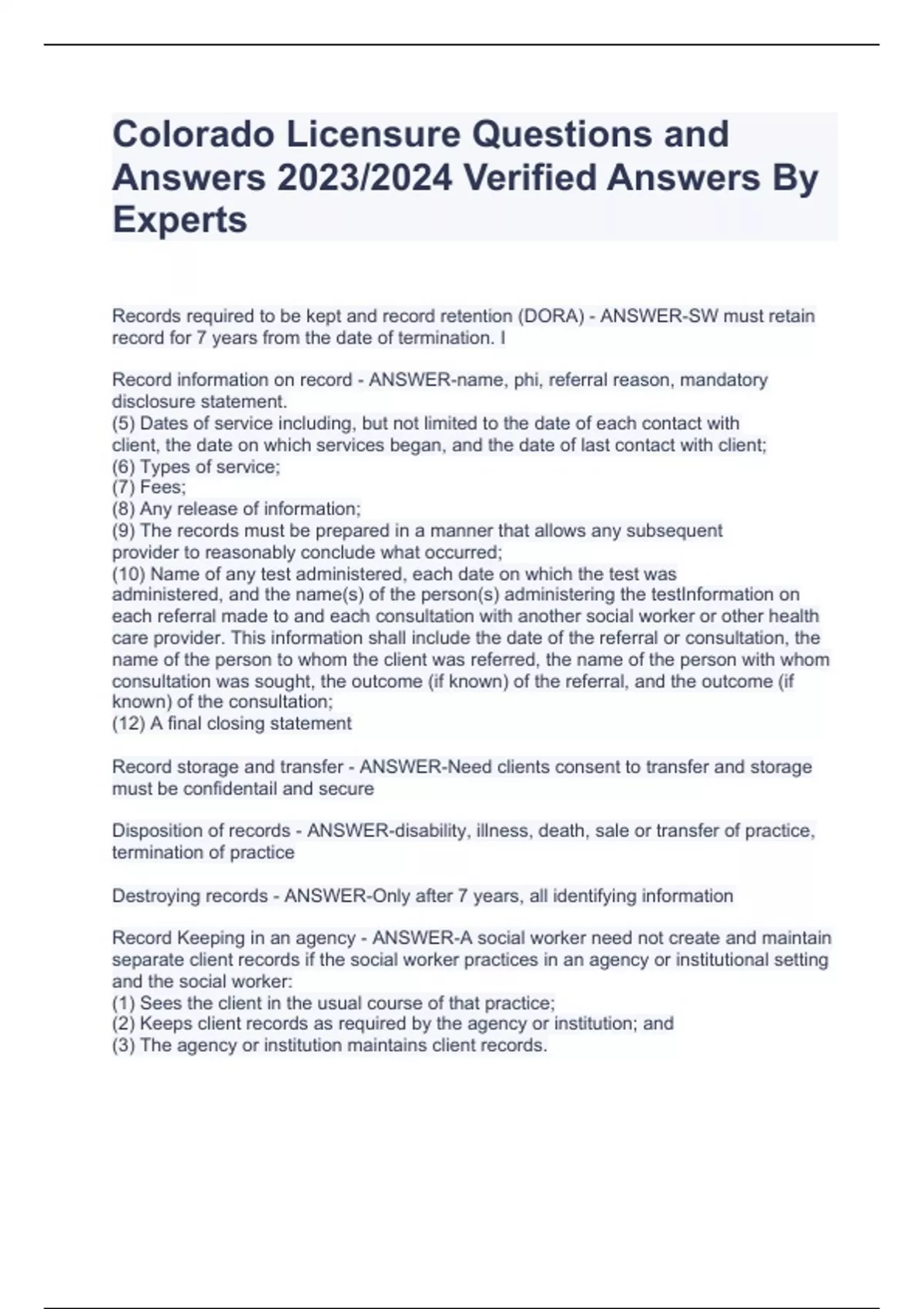 Colorado Licensure Questions and Answers 2023/2024 Verified Answers By Experts Colorado Licensure Questions and Answers 2023/2024 Verified Answers By Experts Colorado Licensure Questions and Answers 2023/2024 Verified Answers By Experts Colorado Licensure Questions and Answers 2023/2024 Verified Answers By Experts Records required to be kept and record retention (DORA) - ANSWER-SW must retain record for 7 years from the date of termination. I Record information on record - ANSWER-name, phi, referral reason, mandatory disclosure statement. (5) Dates of service including, but not limited to the date of each contact with client, the date on which services began, and the date of last contact with client; (6) Types of service; (7) Fees; (8) Any release of information; (9) The records must be prepared in a manner that allows any subsequent provider to reasonably conclude what occurred; (10) Name of any test administered, each date on which the test was administered, and the name(s) of the person(s) administering the testInformation on each referral made to and each consultation with another social worker or other health care provider. This information shall include the date of the referral or consultation, the name of the person to whom the client was referred, the name of the person with whom consultation was sought, the outcome (if known) of the referral, and the outcome (if known) of the consultation; (12) A final closing statement Record storage and transfer - ANSWER-Need clients consent to transfer and storage must be confidentail and secure Disposition of records - ANSWER-disability, illness, death, sale or transfer of practice, termination of practice Destroying records - ANSWER-Only after 7 years, all identifying information Record Keeping in an agency - ANSWER-A social worker need not create and maintain separate client records if the social worker practices in an agency or institutional setting and the social worker: (1) Sees the client in the usual course of that practice; (2) Keeps client records as required by the agency or institution; and (3) The agency or institution maintains client records.