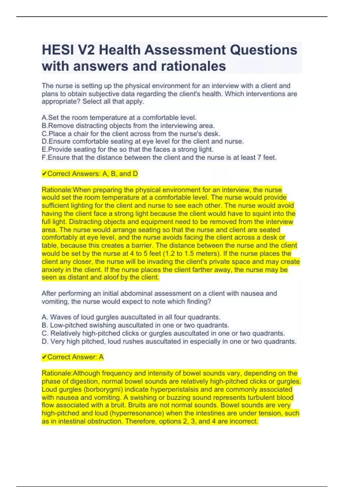 HESI V2 Health Assessment Questions with answers and rationales