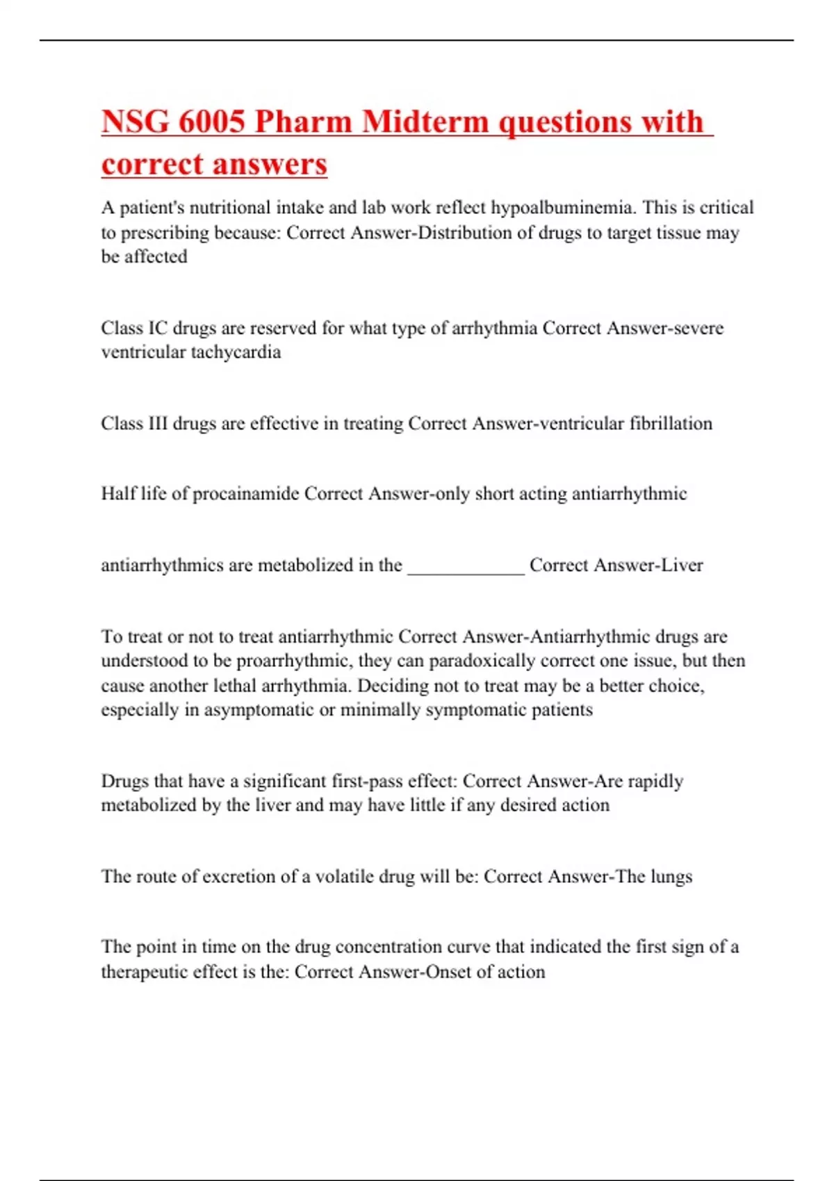A patient's nutritional intake and lab work reflect hypoalbuminemia. This is critical to prescribing because: Correct Answer-Distribution of drugs to target tissue may be affected Class IC drugs are reserved for what type of arrhythmia Correct Answer-severe ventricular tachycardia Class III drugs are effective in treating Correct Answer-ventricular fibrillation Half life of procainamide Correct Answer-only short acting antiarrhythmic antiarrhythmics are metabolized in the ____________ Correct Answer-Liver To treat or not to treat antiarrhythmic Correct Answer-Antiarrhythmic drugs are understood to be proarrhythmic, they can paradoxically correct one issue, but then cause another lethal arrhythmia. Deciding not to treat may be a better choice, especially in asymptomatic or minimally symptomatic patients Drugs that have a significant first-pass effect: Correct Answer-Are rapidly metabolized by the liver and may have little if any desired action The route of excretion of a volatile drug will be: Correct Answer-The lungs The point in time on the drug concentration curve that indicated the first sign of a therapeutic effect is the: Correct Answer-Onset of action