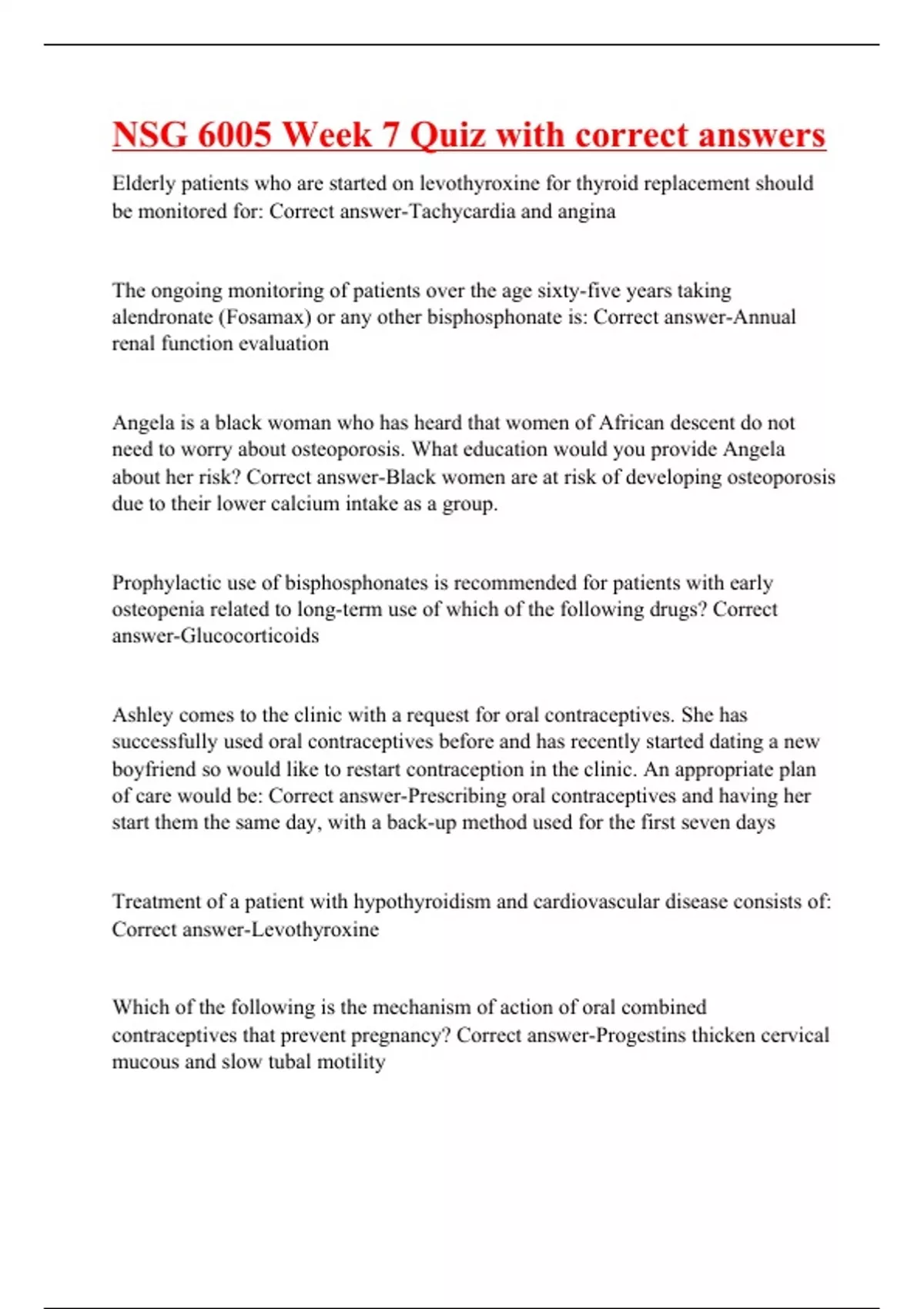 Elderly patients who are started on levothyroxine for thyroid replacement should be monitored for: Correct answer-Tachycardia and angina The ongoing monitoring of patients over the age sixty-five years taking alendronate (Fosamax) or any other bisphosphonate is: Correct answer-Annual renal function evaluation Angela is a black woman who has heard that women of African descent do not need to worry about osteoporosis. What education would you provide Angela about her risk? Correct answer-Black women are at risk of developing osteoporosis due to their lower calcium intake as a group. Prophylactic use of bisphosphonates is recommended for patients with early osteopenia related to long-term use of which of the following drugs? Correct answer-Glucocorticoids Ashley comes to the clinic with a request for oral contraceptives. She has successfully used oral contraceptives before and has recently started dating a new boyfriend so would like to restart contraception in the clinic. An appropriate plan of care would be: Correct answer-Prescribing oral contraceptives and having her start them the same day, with a back-up method used for the first seven days Treatment of a patient with hypothyroidism and cardiovascular disease consists of: Correct answer-Levothyroxine Which of the following is the mechanism of action of oral combined contraceptives that prevent pregnancy? Correct answer-Progestins thicken cervical mucous and slow tubal motility Medroxyprogesterone (Depo Provera) injection has an US