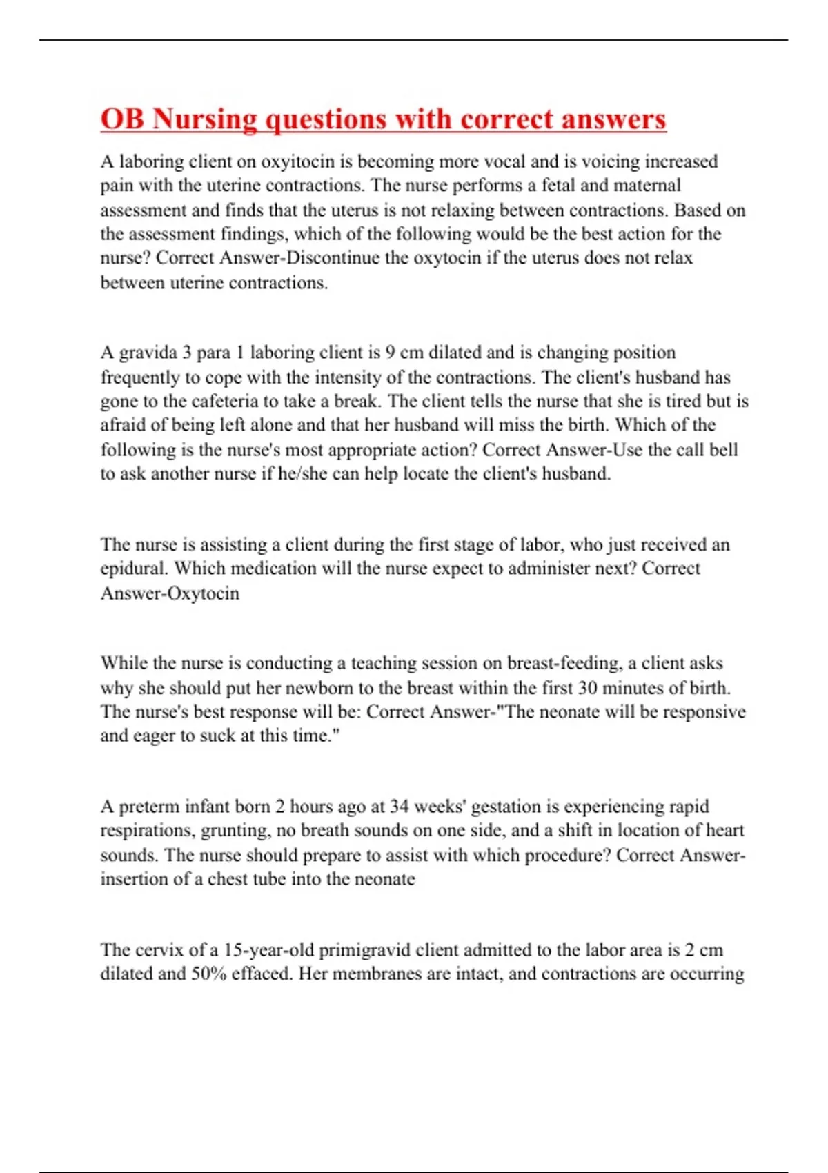 A laboring client on oxyitocin is becoming more vocal and is voicing increased pain with the uterine contractions. The nurse performs a fetal and maternal assessment and finds that the uterus is not relaxing between contractions. Based on the assessment findings, which of the following would be the best action for the nurse? Correct Answer-Discontinue the oxytocin if the uterus does not relax between uterine contractions. A gravida 3 para 1 laboring client is 9 cm dilated and is changing position frequently to cope with the intensity of the contractions. The client's husband has gone to the cafeteria to take a break. The client tells the nurse that she is tired but is afraid of being left alone and that her husband will miss the birth. Which of the following is the nurse's most appropriate action? Correct Answer-Use the call bell to ask another nurse if he/she can help locate the client's husband. The nurse is assisting a client during the first stage of labor, who just received an epidural. Which medication will the nurse expect to administer next? Correct Answer-Oxytocin While the nurse is conducting a teaching session on breast-feeding, a client asks why she should put her newborn to the breast within the first 30 minutes of birth. The nurse's best response will be: Correct Answer-"The neonate will be responsive and eager to suck at this time." A preterm infant born 2 hours ago at 34 weeks' gestation is experiencing rapid respirations, grunting, no breath sounds on one side, and a shift in location of heart sounds. The nurse should prepare to assist with which procedure? Correct Answer-insertion of a chest tube into the neonate The cervix of a 15-year-old primigravid client admitted to the labor area is 2 cm dilated and 50% effaced. Her membranes are intac