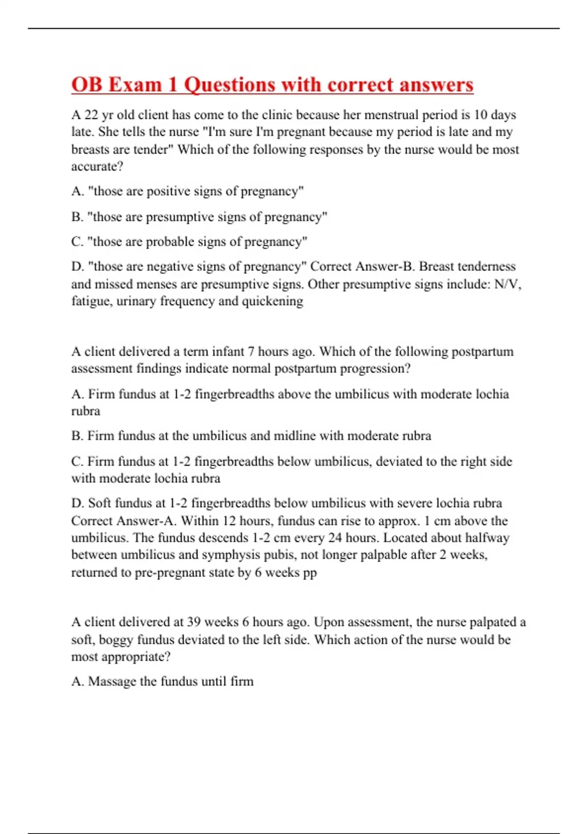 A 22 yr old client has come to the clinic because her menstrual period is 10 days late. She tells the nurse "I'm sure I'm pregnant because my period is late and my breasts are tender" Which of the following responses by the nurse would be most accurate? A. "those are positive signs of pregnancy" B. "those are presumptive signs of pregnancy" C. "those are probable signs of pregnancy" D. "those are negative signs of pregnancy" Correct Answer-B. Breast tenderness and missed menses are presumptive signs. Other presumptive signs include: N/V, fatigue, urinary frequency and quickening A client delivered a term infant 7 hours ago. Which of the following postpartum assessment findings indicate normal postpartum progression? A. Firm fundus at 1-2 fingerbreadths above the umbilicus with moderate lochia rubra B. Firm fundus at the umbilicus and midline with moderate rubra C. Firm fundus at 1-2 fingerbreadths below umbilicus, deviated to the right side with moderate lochia rubra D. Soft fundus at 1-2 fingerbreadths below umbilicus with severe lochia rubra Correct Answer-A. Within 12 hours, fundus can rise to approx. 1 cm above the umbilicus. The fundus descends 1-2 cm every 24 hours. Located about halfway between umbilicus and symphysis pubis, not longer palpable after 2 weeks, returned to pre-pregnant state by 6 weeks pp A client delivered at 39 weeks 6 hours ago. Upon assessment, the nurse palpated a soft, boggy fundus deviated to the left side. Which action of the nurse would be most appropriate? A. Massage the fundus until firm