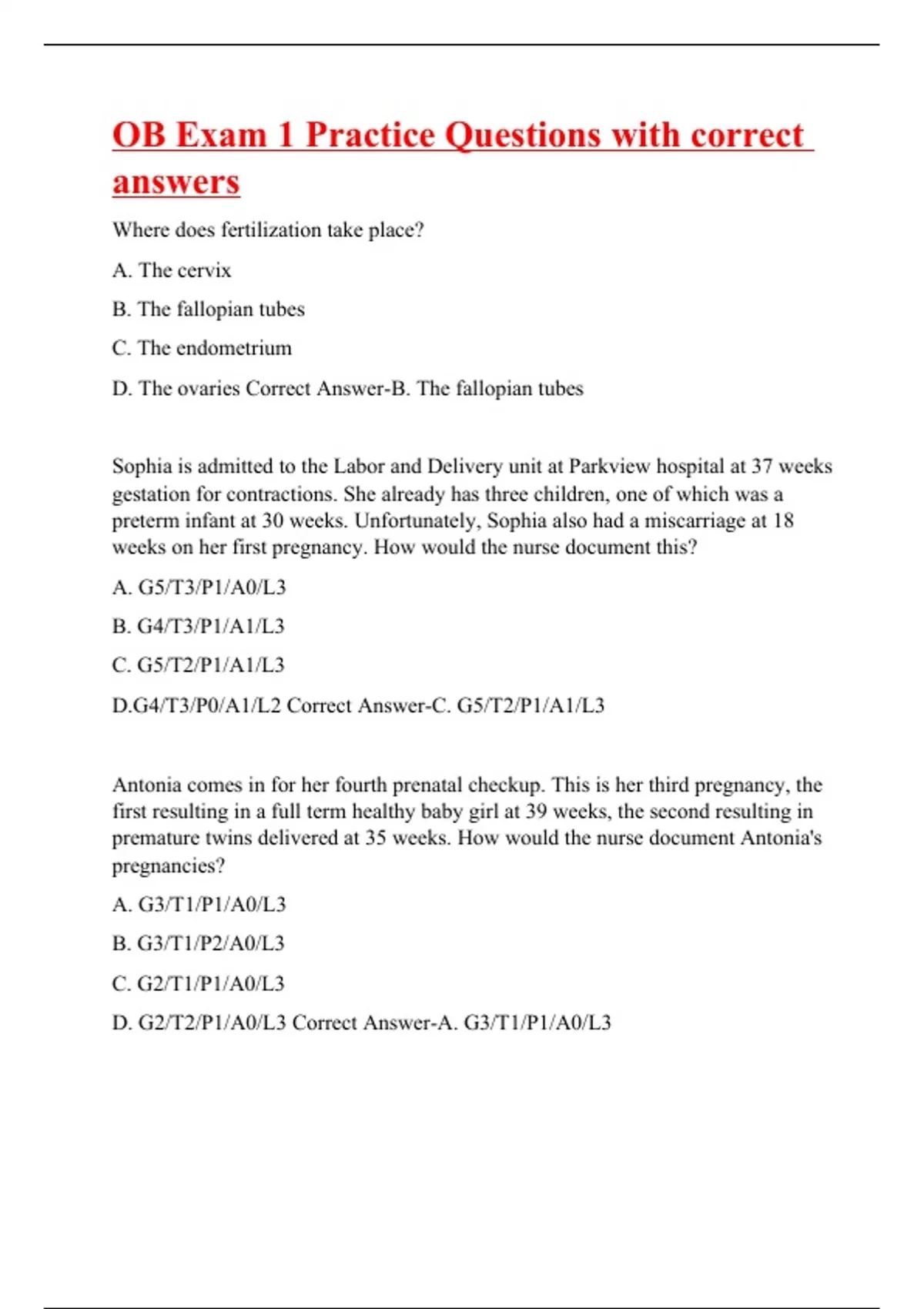 Where does fertilization take place? A. The cervix B. The fallopian tubes C. The endometrium D. The ovaries Correct Answer-B. The fallopian tubes Sophia is admitted to the Labor and Delivery unit at Parkview hospital at 37 weeks gestation for contractions. She already has three children, one of which was a preterm infant at 30 weeks. Unfortunately, Sophia also had a miscarriage at 18 weeks on her first pregnancy. How would the nurse document this? A. G5/T3/P1/A0/L3 B. G4/T3/P1/A1/L3 C. G5/T2/P1/A1/L3 D.G4/T3/P0/A1/L2 Correct Answer-C. G5/T2/P1/A1/L3 Antonia comes in for her fourth prenatal checkup. This is her third pregnancy, the first resulting in a full term healthy baby girl at 39 weeks, the second resulting in premature twins delivered at 35 weeks. How would the nurse document Antonia's pregnancies? A. G3/T1/P1/A0/L3 B. G3/T1/P2/A0/L3 C. G2/T1/P1/A0/L3 D. G2/T2/P1/A0/L3 Correct Answer-A.