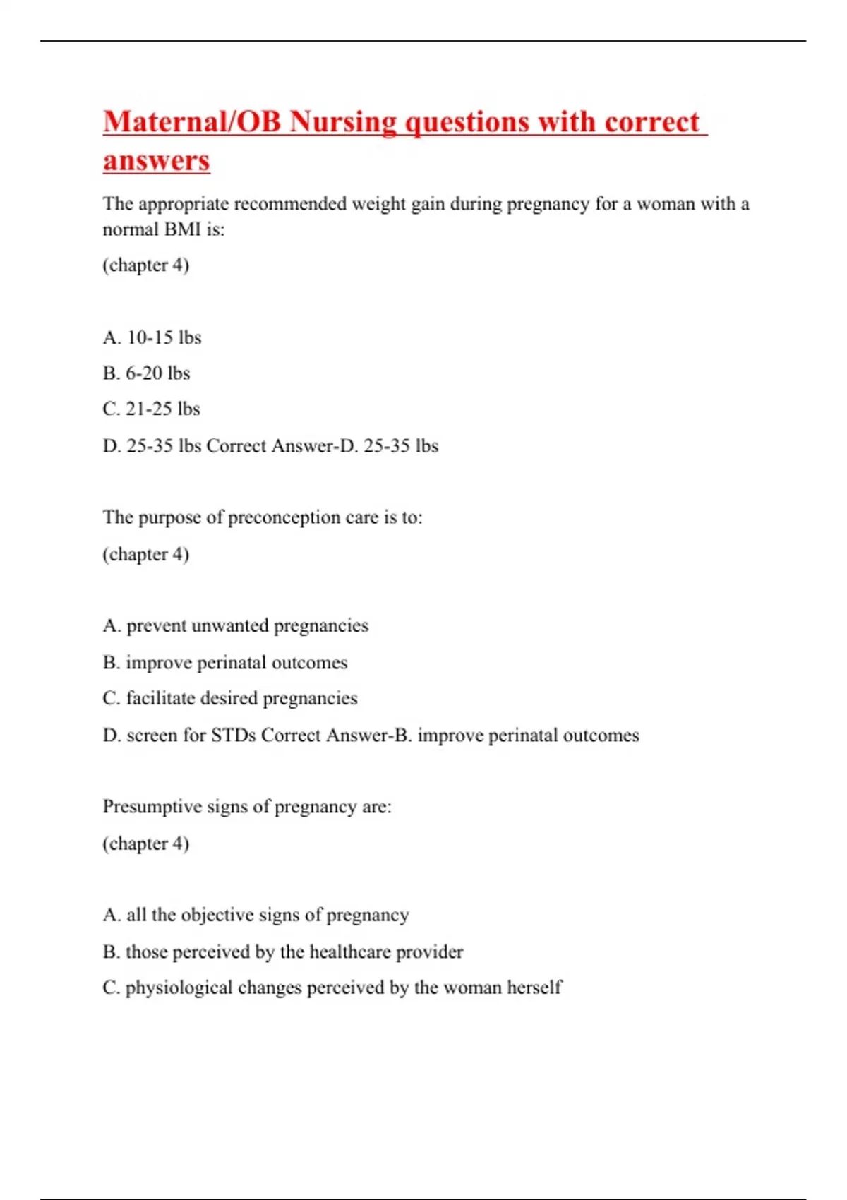 The appropriate recommended weight gain during pregnancy for a woman with a normal BMI is: (chapter 4) A. 10-15 lbs B. 6-20 lbs C. 21-25 lbs D. 25-35 lbs Correct Answer-D. 25-35 lbs The purpose of preconception care is to: (chapter 4) A. prevent unwanted pregnancies B. improve perinatal outcomes C. facilitate desired pregnancies D. screen for STDs Correct Answer-B. improve perinatal outcomes Presumptive signs of pregnancy are: (chapter 4) A. all the objective signs of pregnancy B. those perceived by the healthcare provider C. physiological changes perceived by t