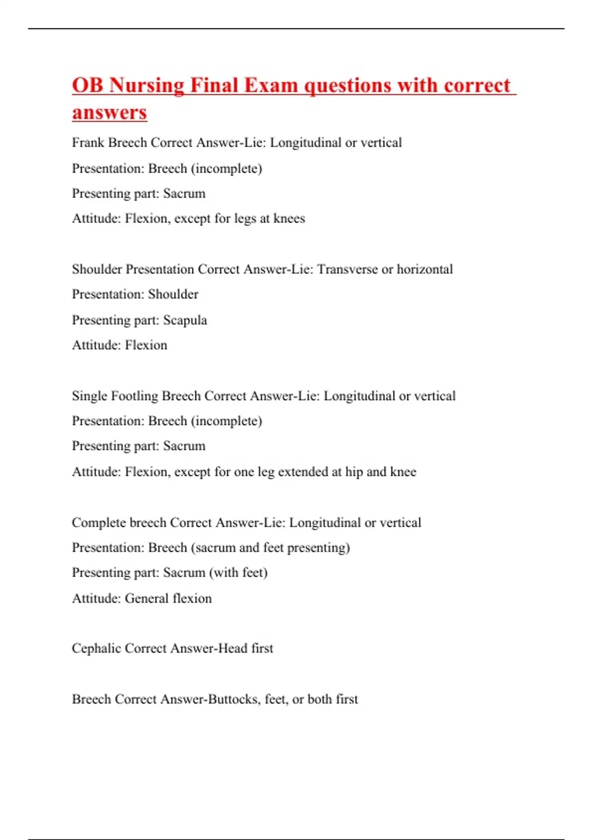 Frank Breech Correct Answer-Lie: Longitudinal or vertical Presentation: Breech (incomplete) Presenting part: Sacrum Attitude: Flexion, except for legs at knees Shoulder Presentation Correct Answer-Lie: Transverse or horizontal Presentation: Shoulder Presenting part: Scapula Attitude: Flexion Single Footling Breech Correct Answer-Lie: Longitudinal or vertical Presentation: Breech (incomplete) Presenting part: Sacrum Attitude: Flexion, except for one leg extended at hip and knee Complete breech Correct Answer-Lie: Longitudinal or vertical Presentation: Breech (sacrum and feet presenting) Presenting part: Sacrum (with feet) Attitude: General flexion Cephalic Correct Answer-Head first Breech Correct Answer-Buttocks, feet, or