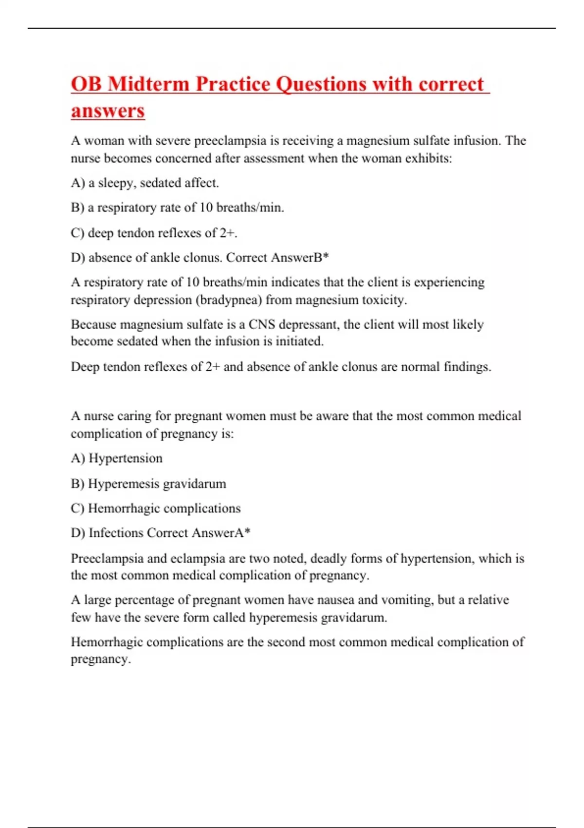 A woman with severe preeclampsia is receiving a magnesium sulfate infusion. The nurse becomes concerned after assessment when the woman exhibits: A) a sleepy, sedated affect. B) a respiratory rate of 10 breaths/min. C) deep tendon reflexes of 2+. D) absence of ankle clonus. Correct AnswerB* A respiratory rate of 10 breaths/min indicates that the client is experiencing respiratory depression (bradypnea) from magnesium toxicity. Because magnesium sulfate is a CNS depressant, the client will most likely become sedated when the infusion is initiated. Deep tendon reflexes of 2+ and absence of ankle clonus are normal findings. A nurse caring for pregnant women must be aware that the most common medical complication of pregnancy is: A) Hypertension B) Hyperemesis gravidarum C) Hemorrhagic complications D) Infections Correct AnswerA* Preeclampsia and eclampsia are two noted, deadly forms of hypertension, which is the most common medical complication of pregnancy. A large percentage of pregnant women have nausea and vomiting, but a relative few have the severe form called hyperemesis gravidarum. Hemorrhagic complications are the second most common medical complication of pregnancy.