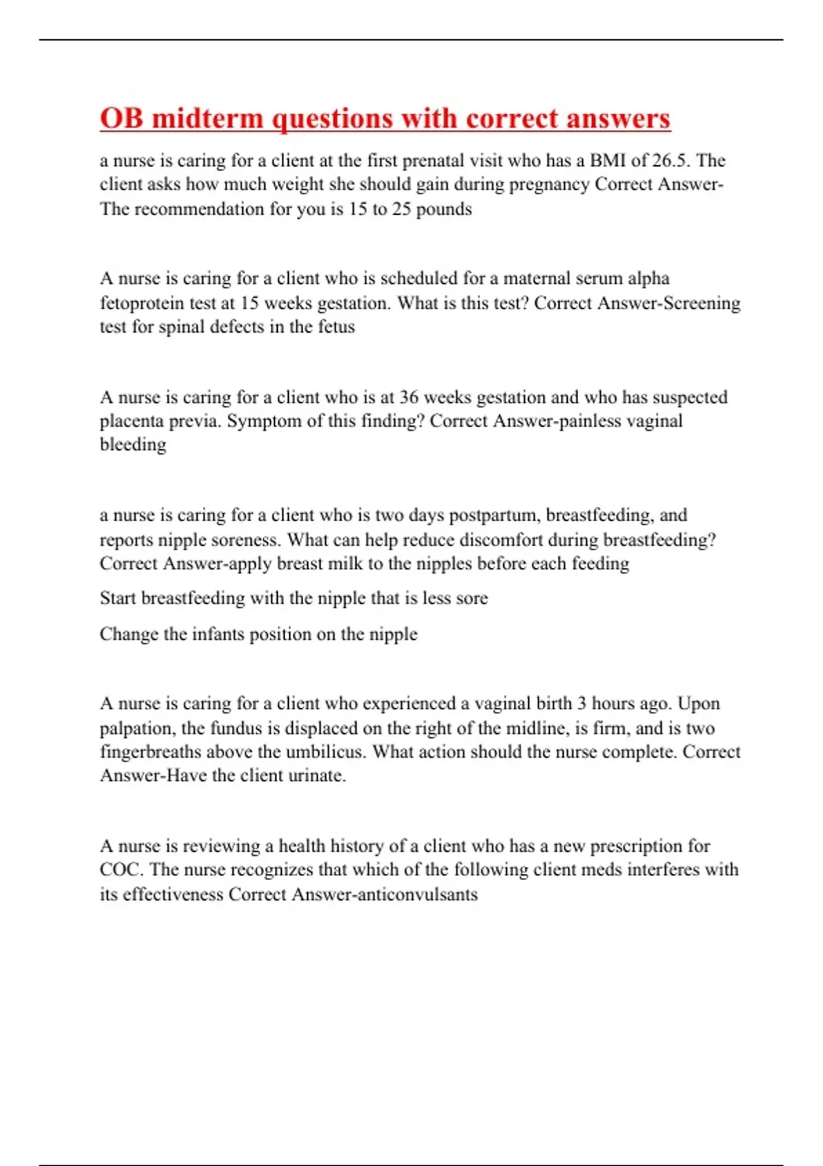 a nurse is caring for a client at the first prenatal visit who has a BMI of 26.5. The client asks how much weight she should gain during pregnancy Correct Answer-The recommendation for you is 15 to 25 pounds A nurse is caring for a client who is scheduled for a maternal serum alpha fetoprotein test at 15 weeks gestation. What is this test? Correct Answer-Screening test for spinal defects in the fetus A nurse is caring for a client who is at 36 weeks gestation and who has suspected placenta previa. Symptom of this finding? Correct Answer-painless vaginal bleeding a nurse is caring for a client who is two days postpartum, breastfeeding, and reports nipple soreness. What can help reduce discomfort during breastfeeding? Correct Answer-apply breast milk to the nipples before each feeding Start breastfeeding with the nipple that is less sore Change the infants position on the nipple A nurse is caring for a client who experienced a vaginal birth 3 hours ago. Upon palpation, the fundus is displaced on the right of the midline, is firm, and is two fingerbreaths above the umbilicus. What action should the nurse complete. Correct Answer-Have the client urinate. A nurse is reviewing a health history of a client who has a new prescription for COC. The nurse recognizes that which of the following client meds interferes with its effectiveness Correct Answer-anticonvulsants