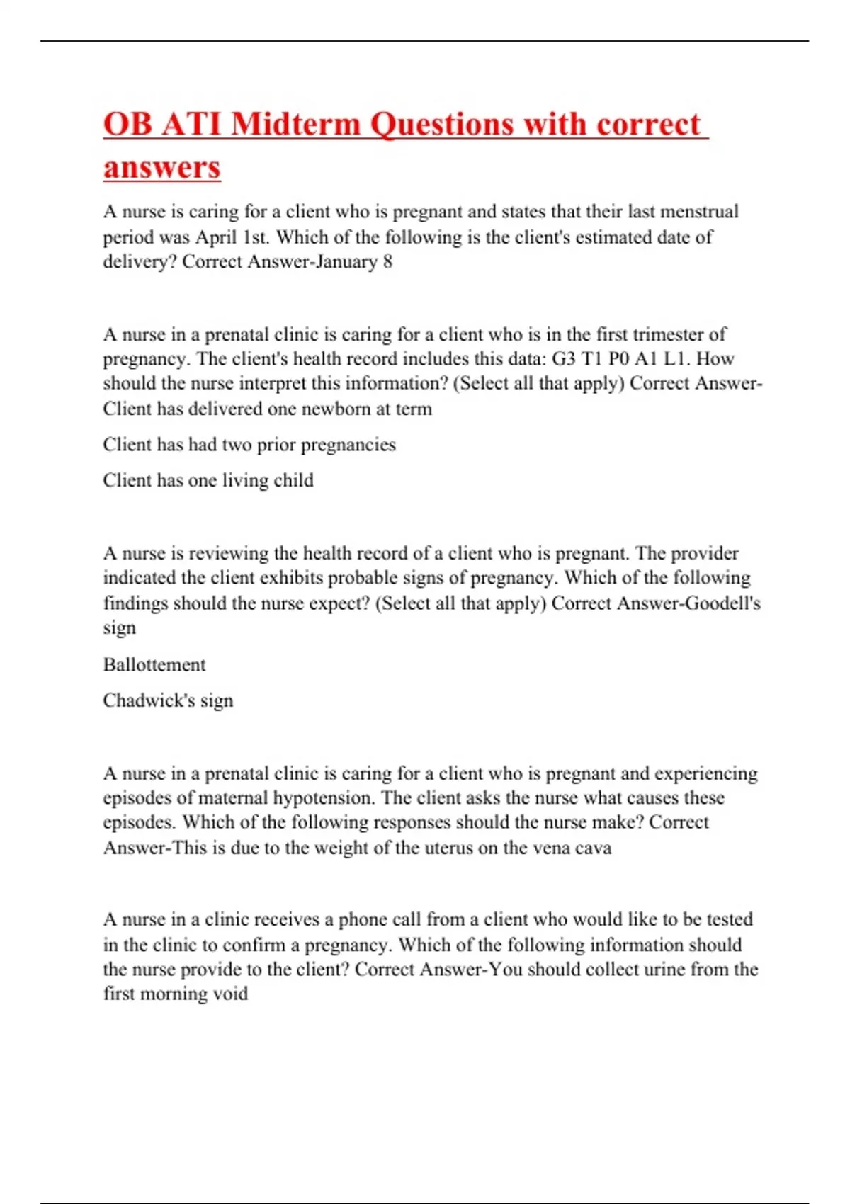 A nurse is caring for a client who is pregnant and states that their last menstrual period was April 1st. Which of the following is the client's estimated date of delivery? Correct Answer-January 8 A nurse in a prenatal clinic is caring for a client who is in the first trimester of pregnancy. The client's health record includes this data: G3 T1 P0 A1 L1. How should the nurse interpret this information? (Select all that apply) Correct Answer-Client has delivered one newborn at term Client has had two prior pregnancies Client has one living child A nurse is reviewing the health record of a client who is pregnant. The provider indicated the client exhibits probable signs of pregnancy. Which of the following findings should the nurse expect? (Select all that apply) Correct Answer-Goodell's sign Ballottement Chadwick's sign A nurse in a prenatal clinic is caring for a client who is pregnant and experiencing episodes of maternal hypotension. The client asks the nurse what causes these episodes. Which of the following responses should the nurse make? Correct Answer-This is due to the weight of the uterus on the vena cava A nurse in a clinic receives a phone call from a client who would like to be tested in the clinic to confirm a pregnancy. Which of the following information should the nurse provide to the client? Correct Answer-You should collect urine from the first morning void